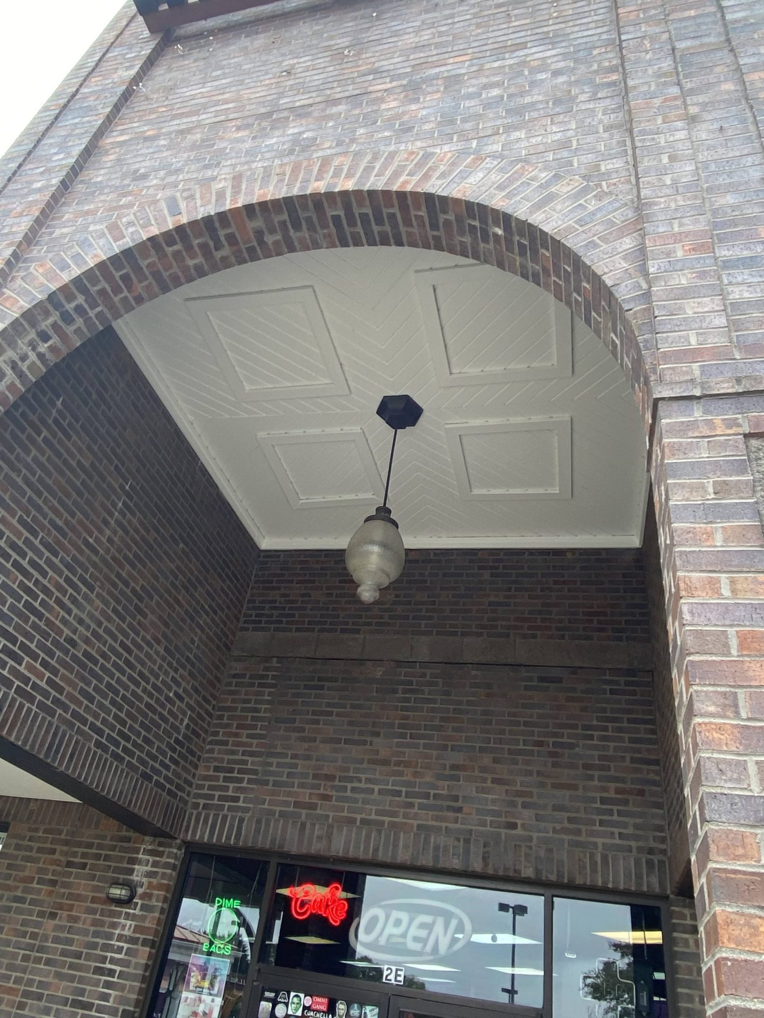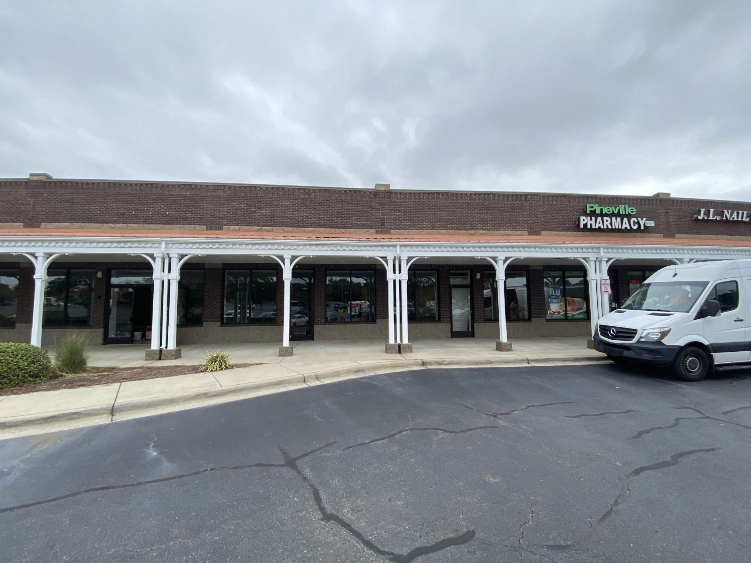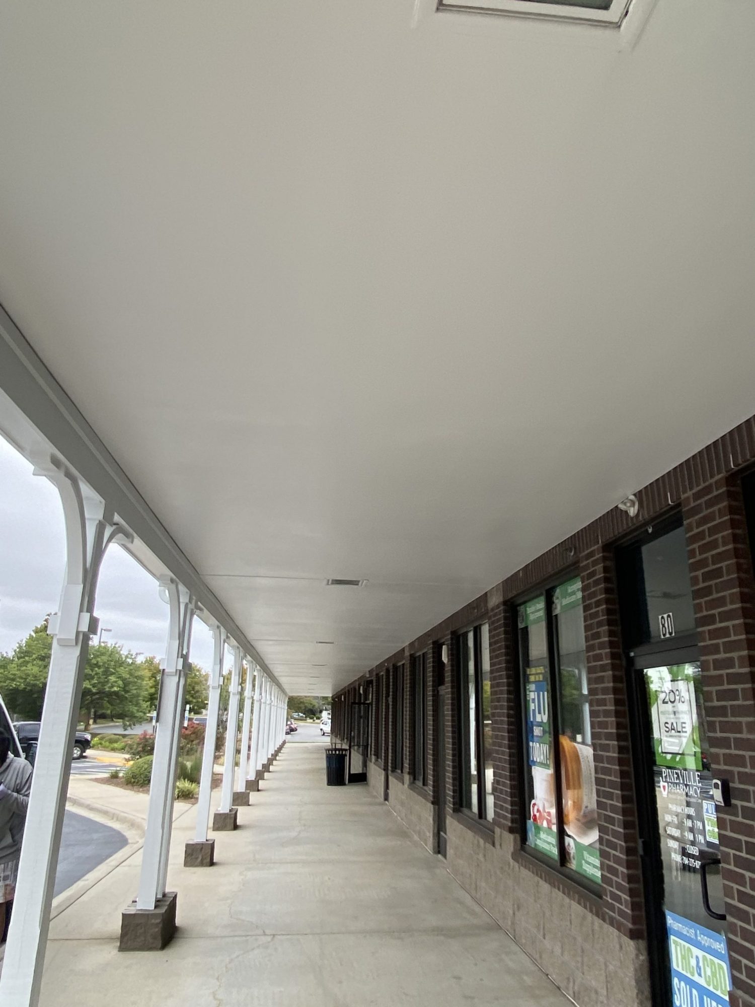 Our team had the opportunity to repaint the portico and columns of this extended sheltered hallway section of this retail shopping center in Pineville, NC.