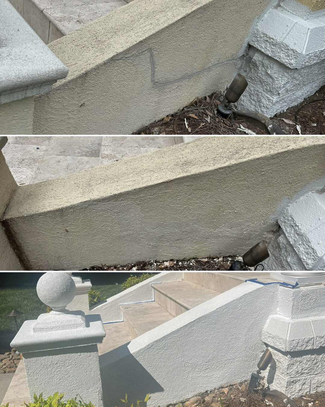 The removal of outdated light fixtures presented another layer of detail work, requiring precise patching and blending to maintain a smooth stucco surface. Our team meticulously filled every crack and blemish, ensuring a uniform finish before paint was applied.
