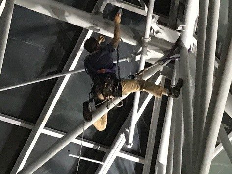 We chose material that is commonly specified for work on bridges, and tanks that hold acidic and caustic chemicals. It also had the useful property of being a moisture cure product. Lastly, we had to figure out how to get our painters up into the structural steel above the tanks in order to execute our plan. We found that one of our painters enjoyed rock climbing as a hobby, and tasked him as our lead man. He hoisted himself up into the steel, attached soft anchor points, and repel lines while wearing the proper PPE and adhering to OSHA requirements.