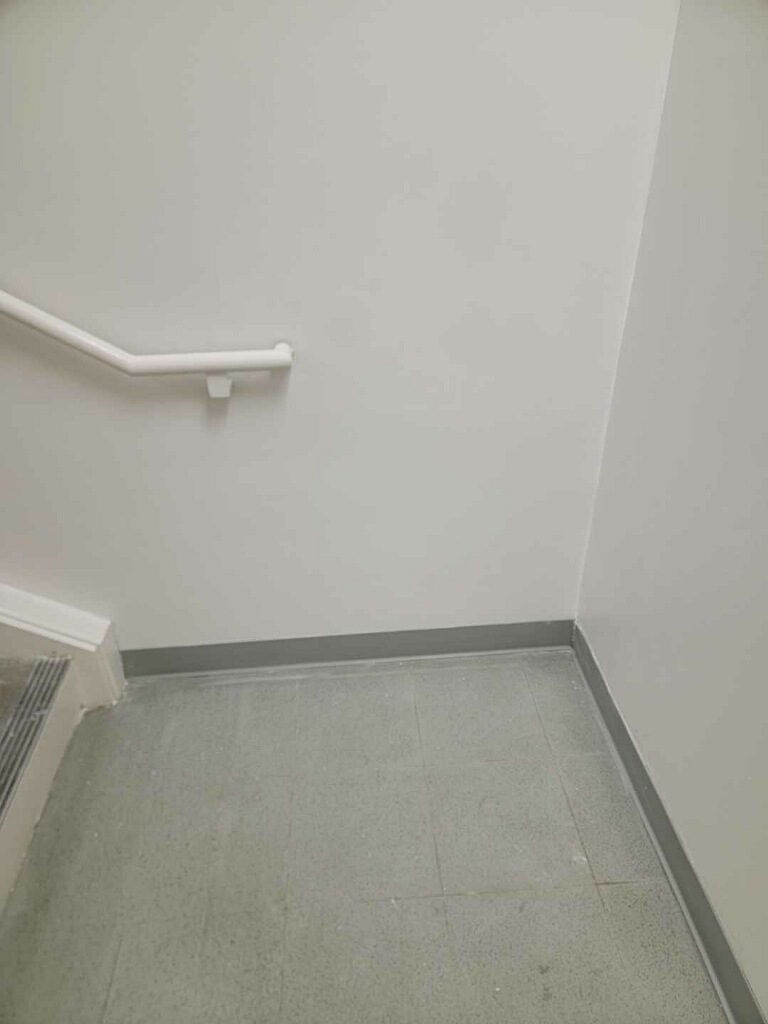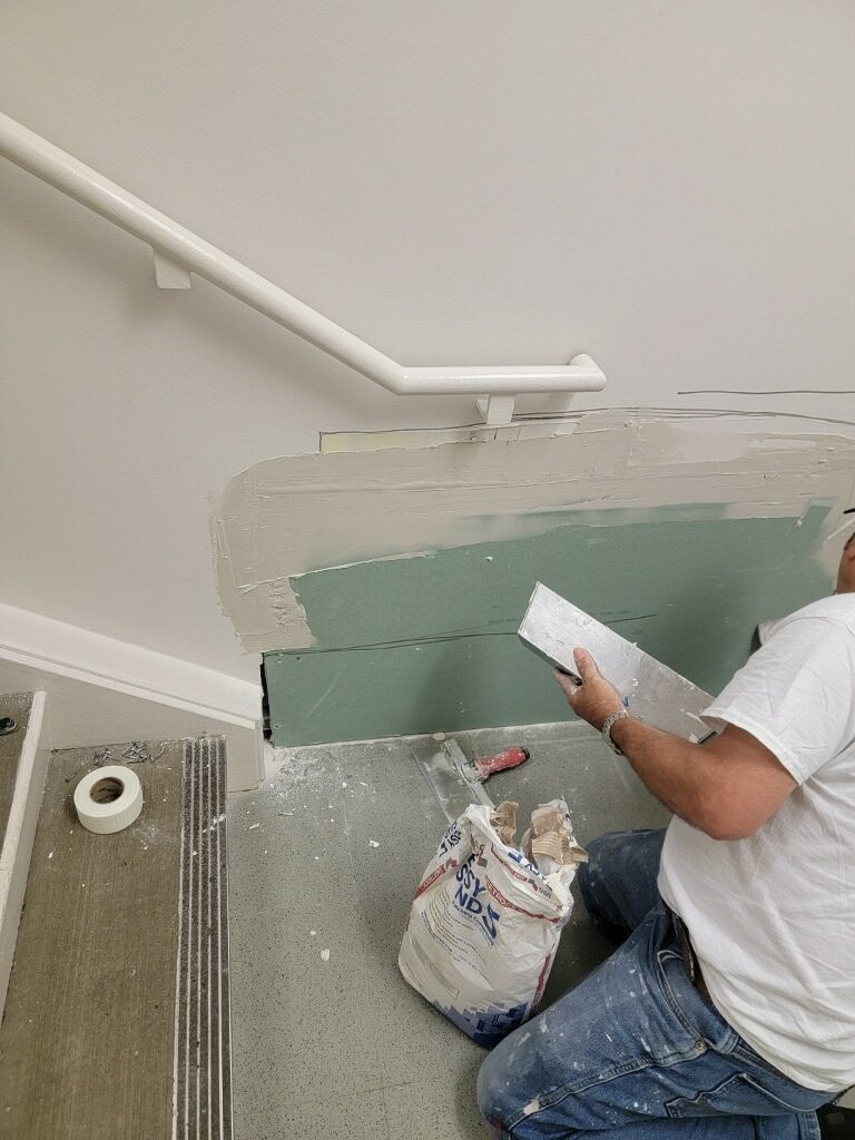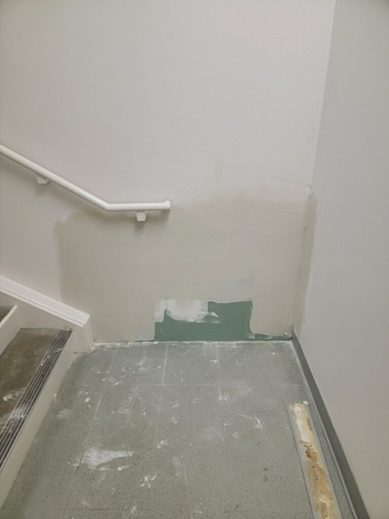 Our team began with a detailed inspection of the stairwell. We identified the specific areas where the drywall was compromised and evaluated the surrounding sections to ensure no further hidden damage. Once the scope of the project was determined, we prepared the area by protecting adjacent surfaces and setting up a workspace that minimized disruption to the store’s operations.