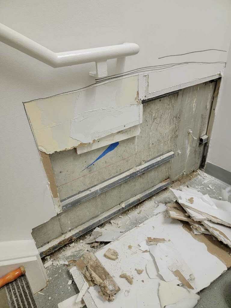 Typically, it’s recommended to inspect drywall every two years, especially in areas prone to high humidity or frequent use. In this case, the drywall in the Apple Store went unchecked for several years. While there were no immediate issues at first, the signs of wear began to escalate. By the time the damage was addressed, simple patches were no longer an option—a larger section required replacement.