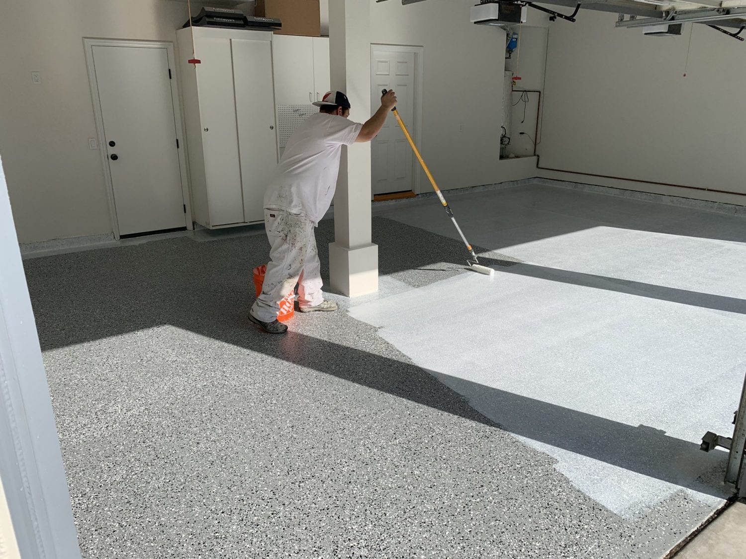 Our house painting crews can provide you with epoxy finishes that are durable and have little maintenance. The application process begins by cleaning the concrete surface and filling any patches, potholes and cracks. We then etch the floor with a bristle broom so that the primer will properly adhere to the concrete.