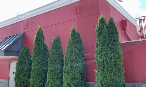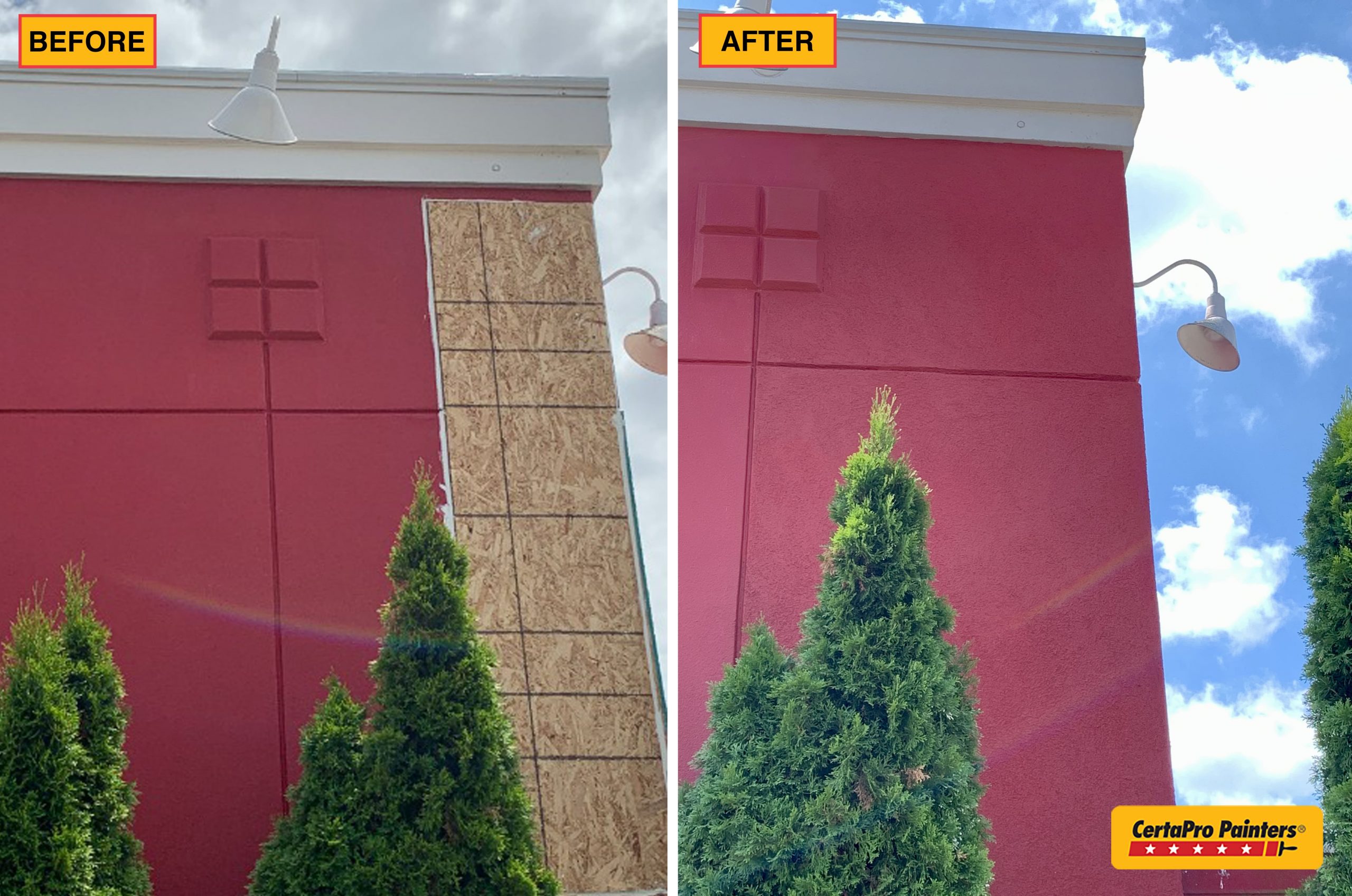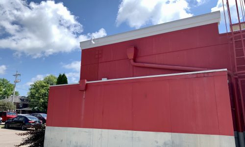 Once the carpentry team completed the EIFS work, our painting team took over. They caulked all of the open seams and once dry, the area was primed. The current exterior of the building was color matched to find the exact red and gray colors and two finish coats were applied.