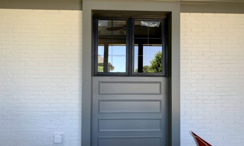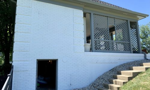 Once all minor carpentry work was completed, we prepped all surface areas to be painted. This involved pressure washing to remove dirt and/or mildew so the finish coat could adhere to surface, caulked all previously caulked areas (windows, doors, wood joints) to seal, scraped all loose peeling paint to ensure a firm base and then lightly sanded these areas. We also had to prep the brick to be painted by washing it with a TSP cleaner (heavy duty cleaner used prior to painting).