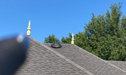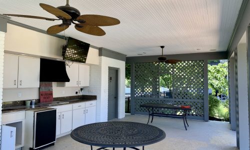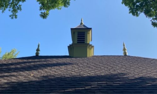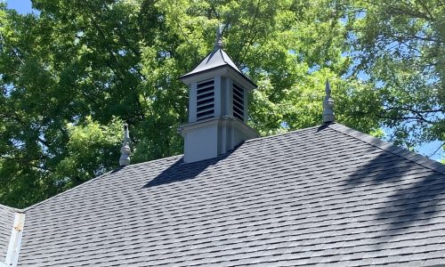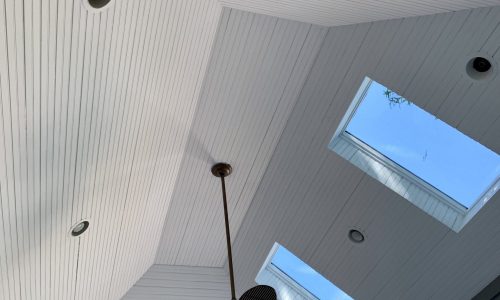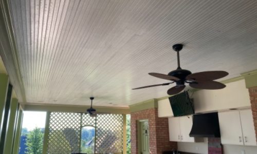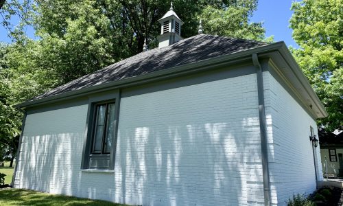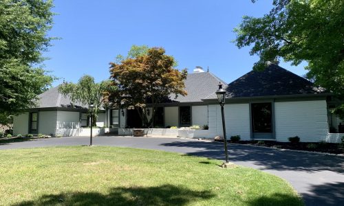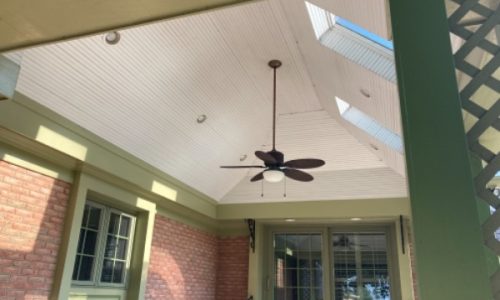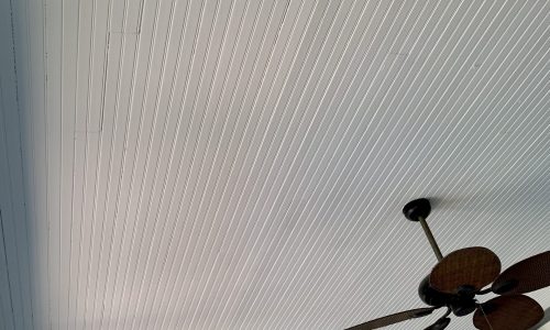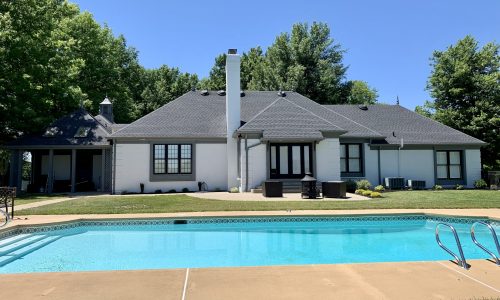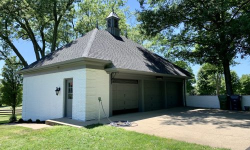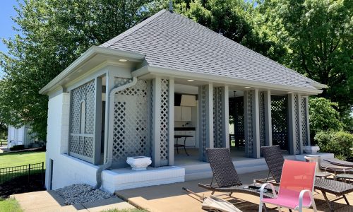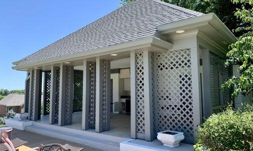 Two coats were applied to the following areas with a satin finish: detached garage, porch ceiling, shed, pool house, downspouts, gutters, soffits, fascia boards, doors, door frames, garage doors, columns, lattice, cupolas, decorative trim, bay windows and all previously painted wood trim.
