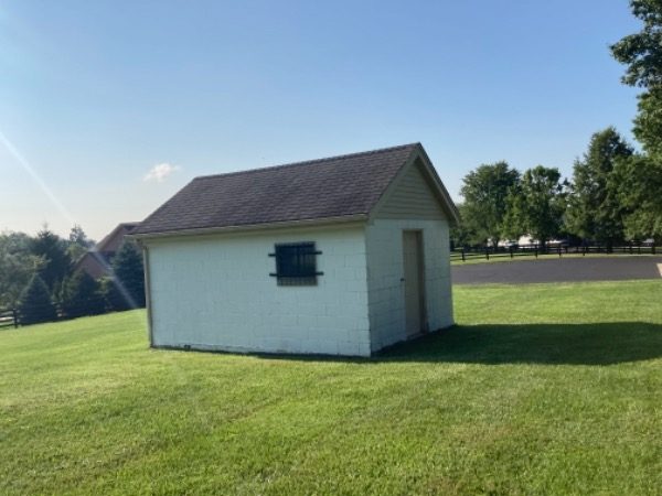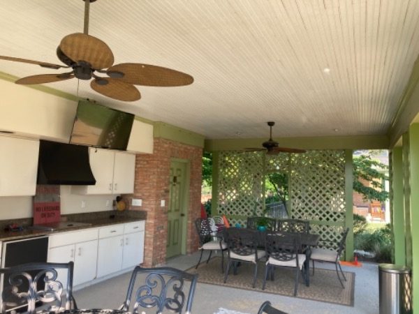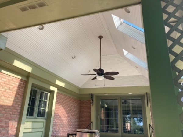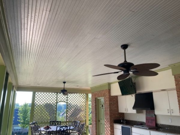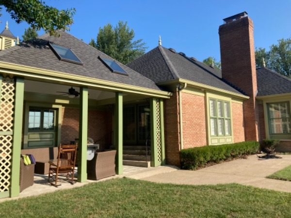 Two coats were applied to the following areas with a satin finish: detached garage, porch ceiling, shed, pool house, downspouts, gutters, soffits, fascia boards, doors, door frames, garage doors, columns, lattice, cupolas, decorative trim, bay windows and all previously painted wood trim.
