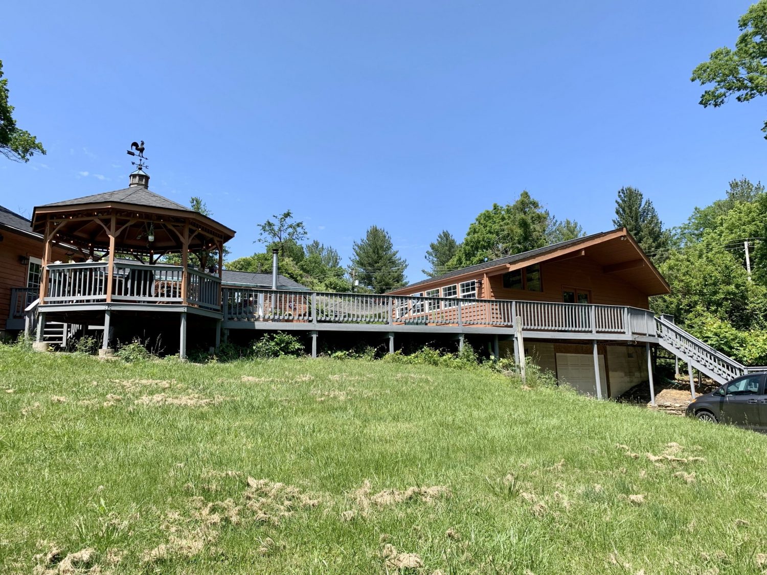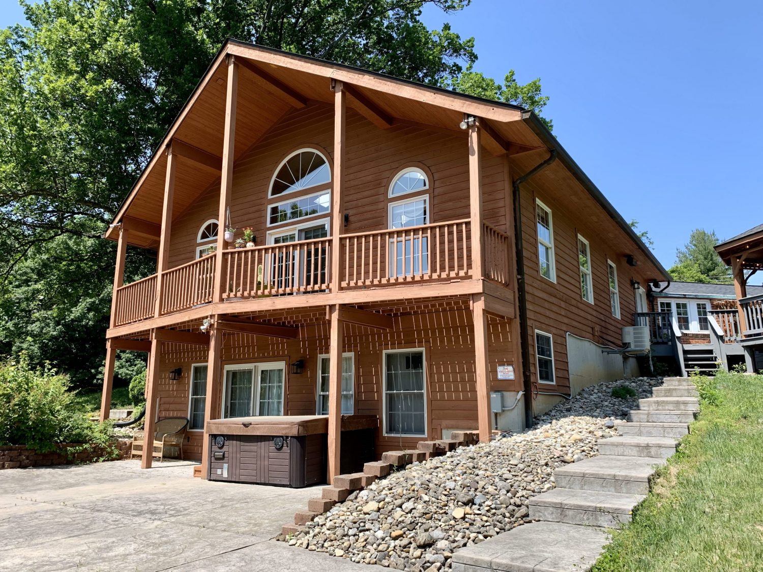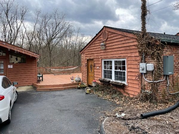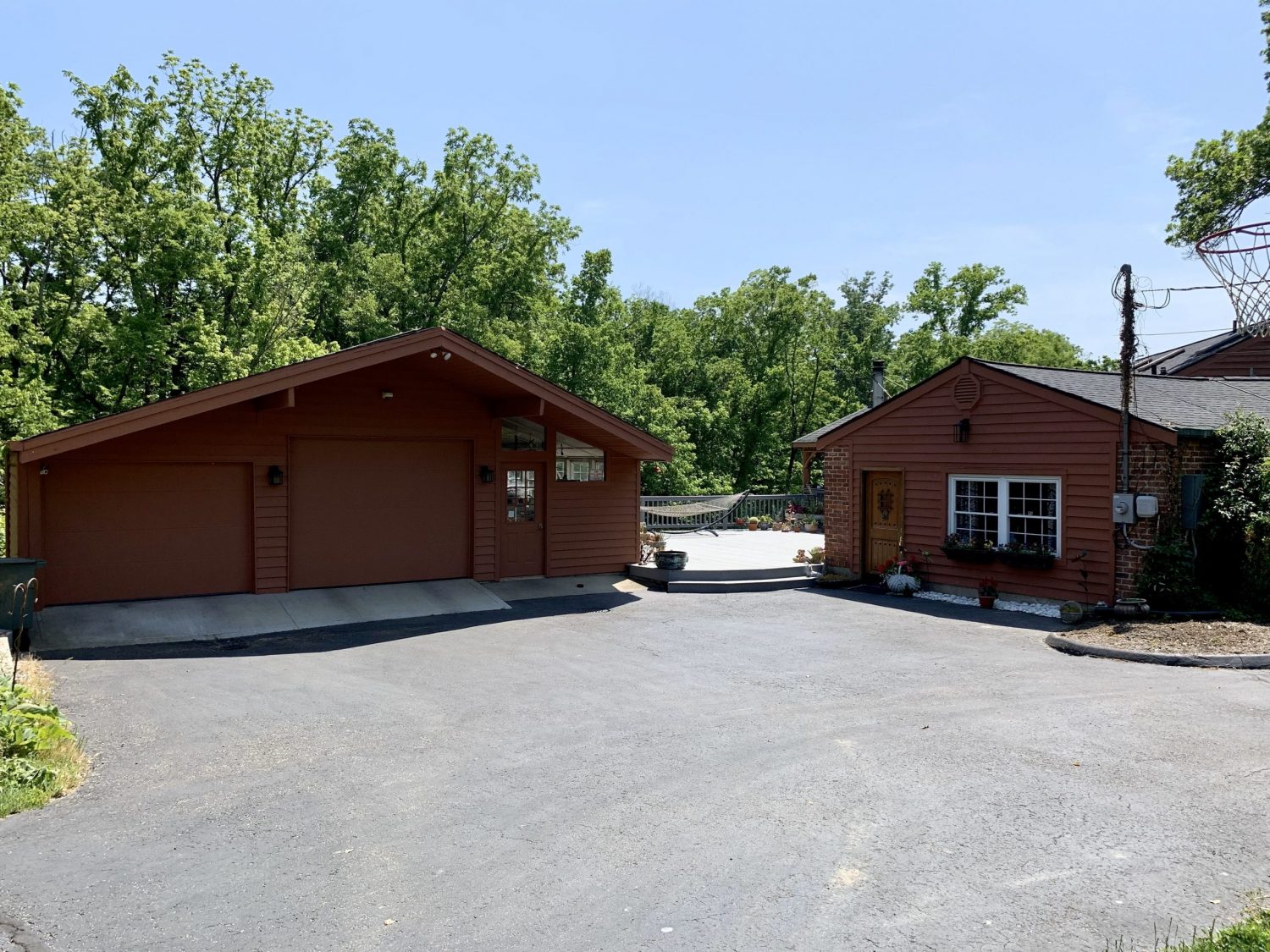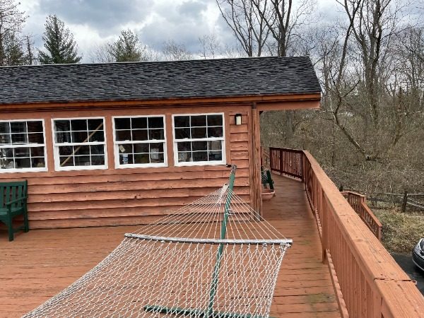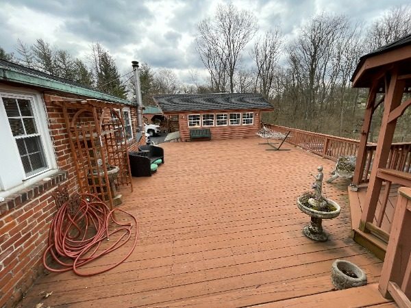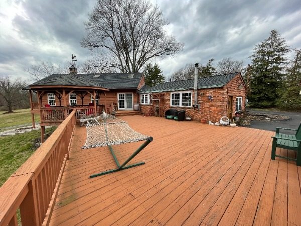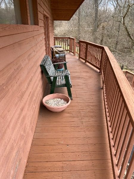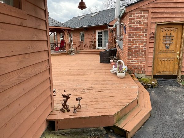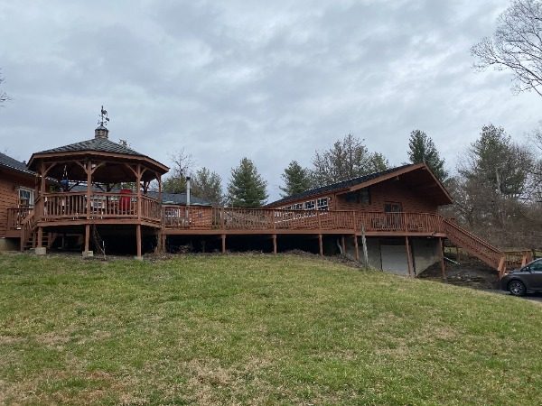 The home we were contracted to do carpentry repairs and paint/stain is a beautiful cabin style home set off Mt. Carmel road. It has all wood siding including on the two car garage. It also has a large wrap around deck with a gazebo, including a balcony off the one side of the home. Because it is an all wood home, it had lost most of its original color. Also, some of the siding needed to be repaired or replaced. Some of the decking was also failing: loose or rotted boards that needed to be fastened or replaced.