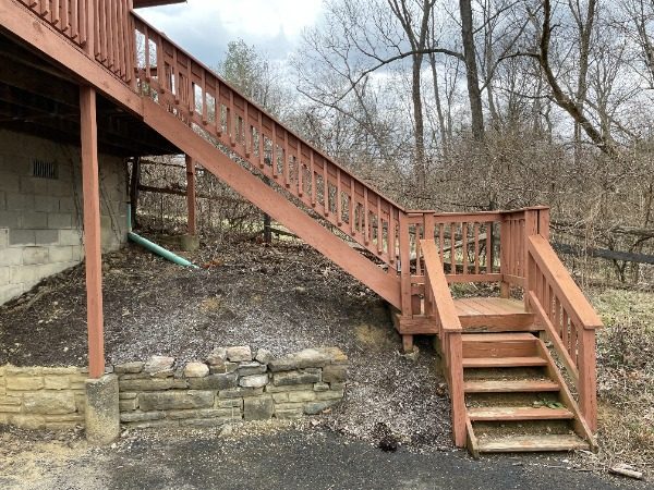 On the back steps of the deck, we installed a new 4×4 post and set in concrete to support and secure the steps, resecured any loose stair treads, installed blocking under each stair tread, resecured the handrail, and installed two brackets at the top of support beams and deck boards to secure.