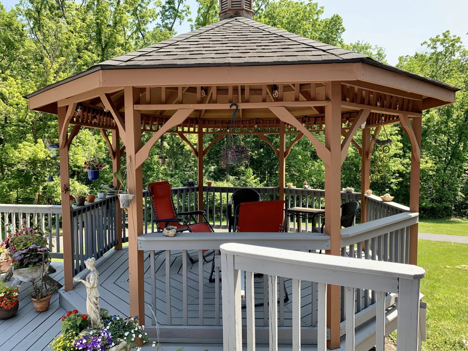 After the prep was complete we started on the exterior painting. We painted/stained two coats on the garage and home the same as the current color. We used two coats of a different color on the deck and balisters. Lastly, we stained the gazebo with two coats of the current color.