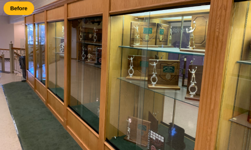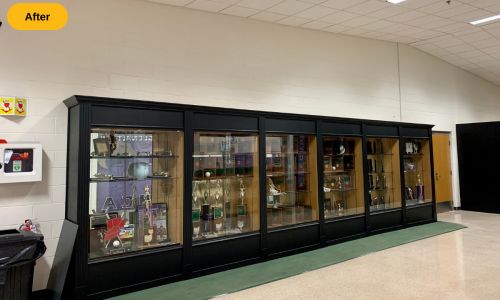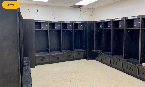 We were contracted to paint multiple areas of the sports facilities at Cincinnati Hills Christian Academy in Cincinnati, Ohio. We painted five different locker rooms at the high school and the trophy cases outside the gym. The prep work involved in the project included cleaning all areas, priming and spot priming over purple areas and graphics, and repairing all damage and nail pops to drywall area.