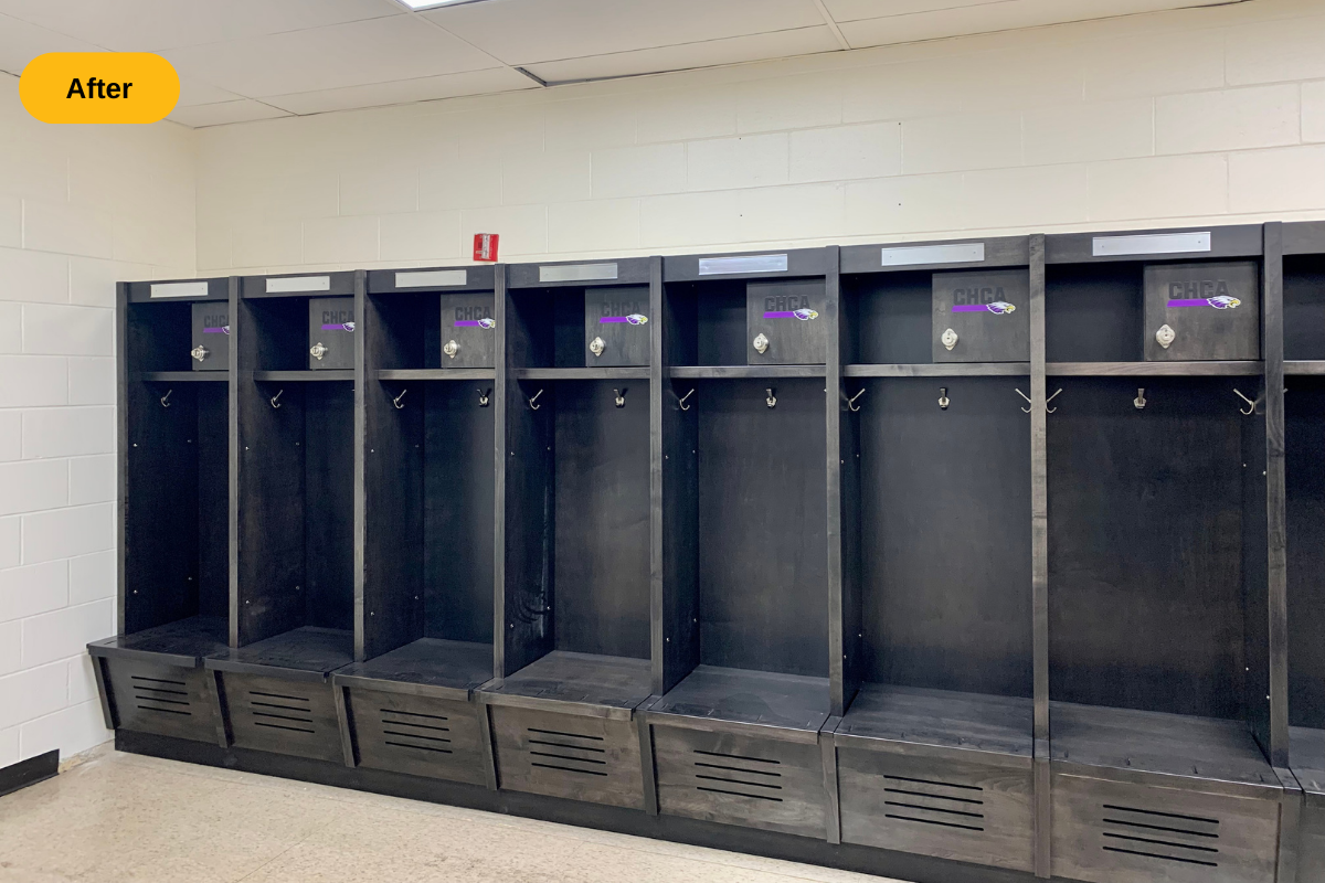 We were contracted to paint multiple areas of the sports facilities at Cincinnati Hills Christian Academy in Cincinnati, Ohio. We painted five different locker rooms at the high school and the trophy cases outside the gym. The prep work involved in the project included cleaning all areas, priming and spot priming over purple areas and graphics, and repairing all damage and nail pops to drywall area.