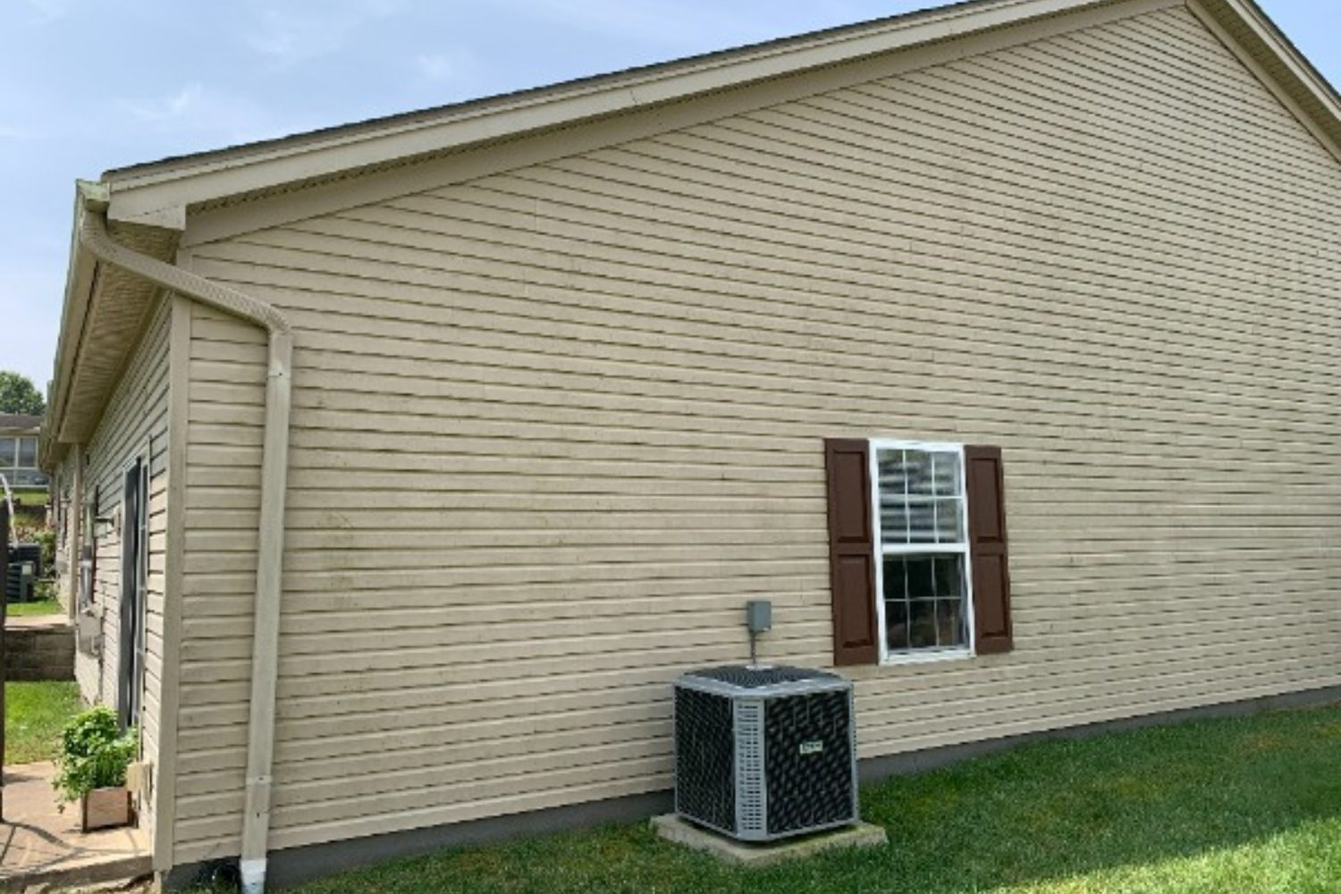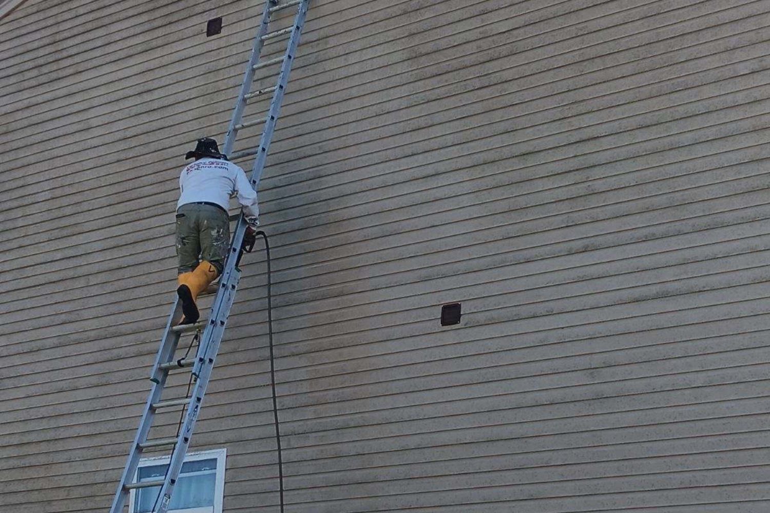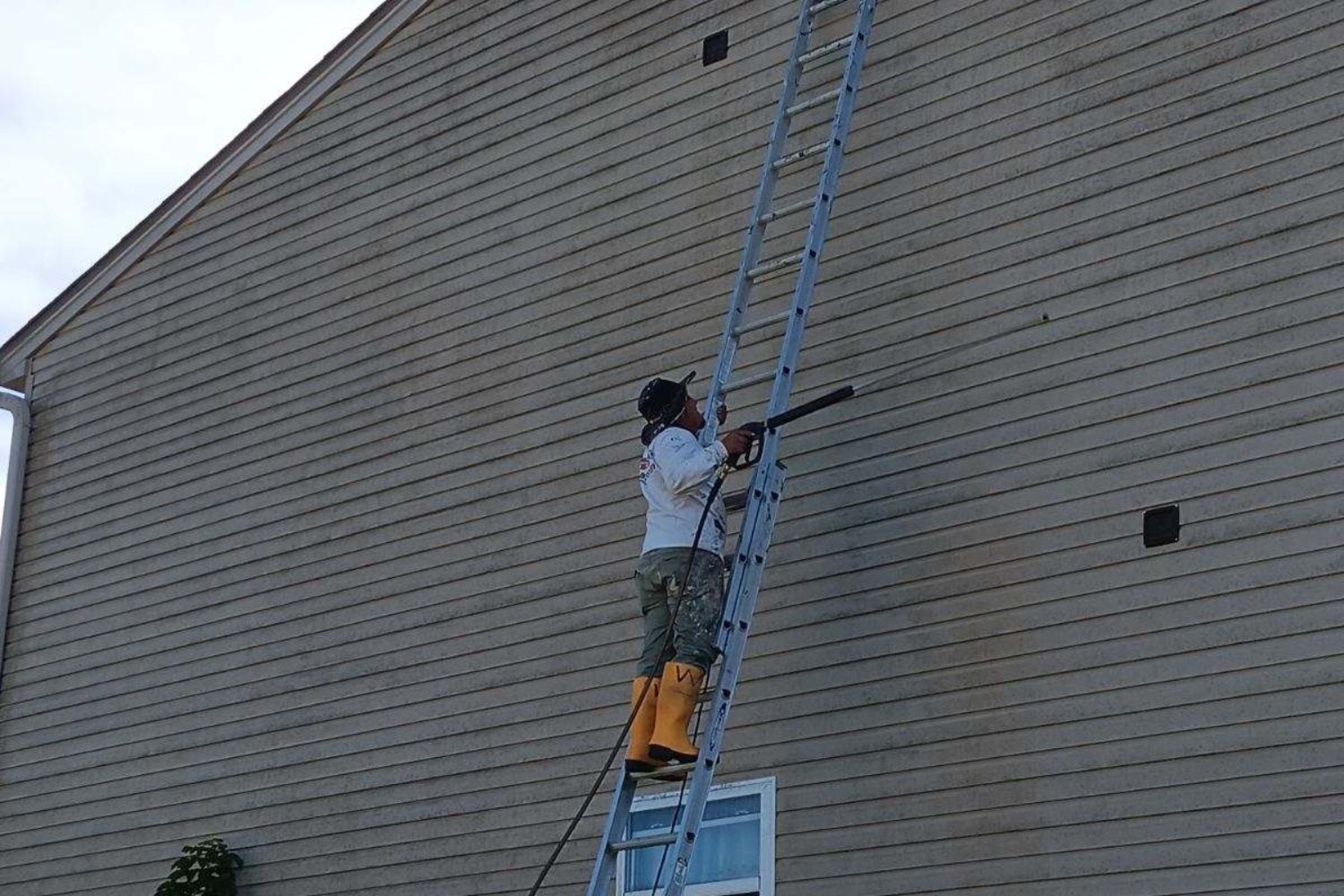 We started by applying a cleaner to all surfaces. Then heavily rinsed all surfaces with a low-pressure water setting to safely clean areas without damaging them. decks and patios were also lightly rinsed to remove dirt. Extremely dirty areas needed to be hand washed with a soft bristle brush.