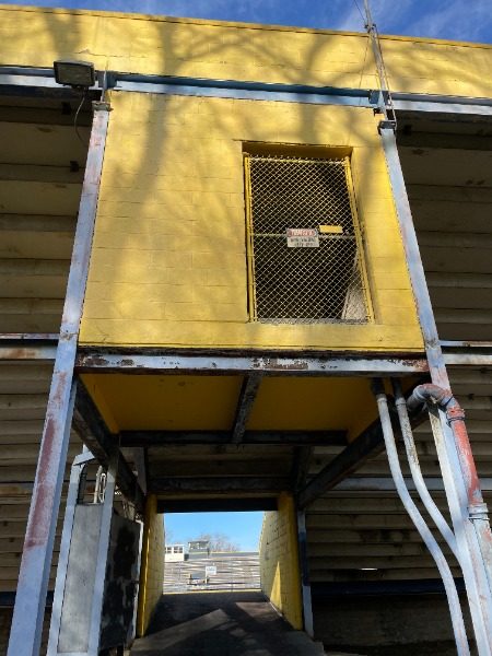 The scope of the project included a variety of surfaces across the stadium: railings, concrete block walls, steel beams, lintels, the press box and its doors, garage and concession stand doors, and window frames.