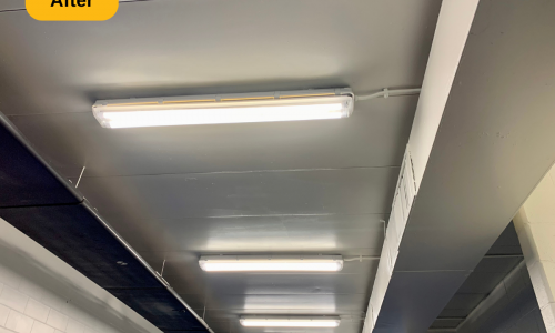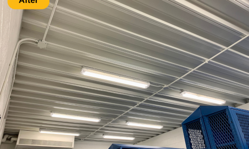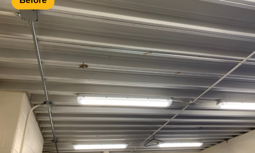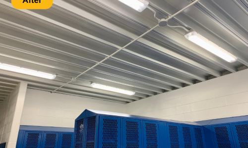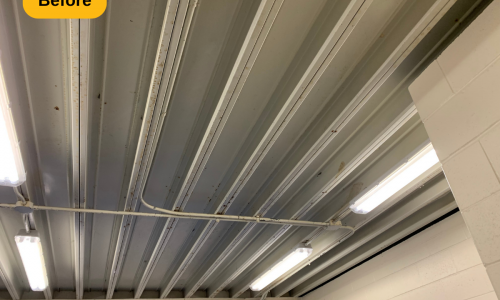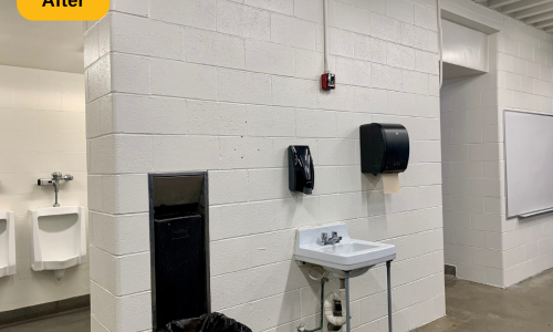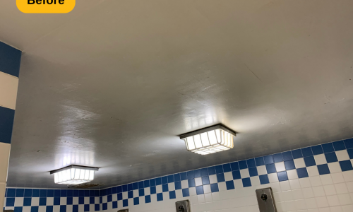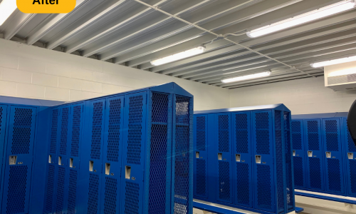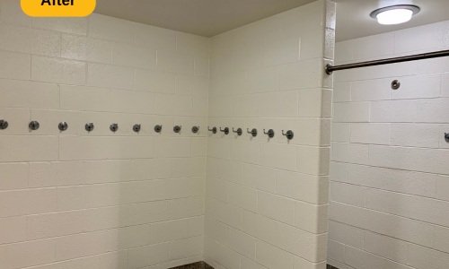 In addition to the mentioned prep work, we also removed all of the loose and peeling paint from the metal deck ceiling, supports, trusses and l-beam supports. We then applied two coats to multiple areas: walls (painted over the stencils and graphics), drywall ceilings and bulkheads, concrete and metal deck ceilings, doors, door frames, and painted window casings. The result is a locker room that looks as if it were just built, ready for years of use.