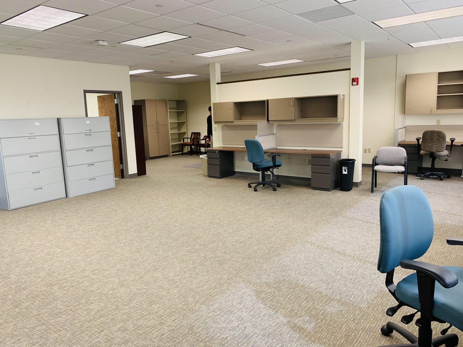 The carpentry team removed 2,050 square feet of carpeting and the old cove base trim from the main office area and two private offices. The areas were prepped using a power floor sander, scraping and sanding the old residue on the walls from the cove bases. Once all areas were prepped, the new cove base trim was installed, along with the new charcoal carpeting in the main office area and the two private offices. This whole project took about a week to complete.