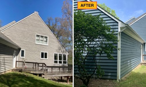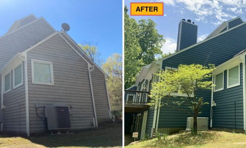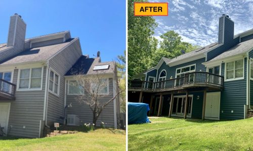 The prep work involved scraping and sanding any loose or peeling paint, caulking any previously caulked areas and then pressure washing the home to remove any dirt, debris, and mildew.