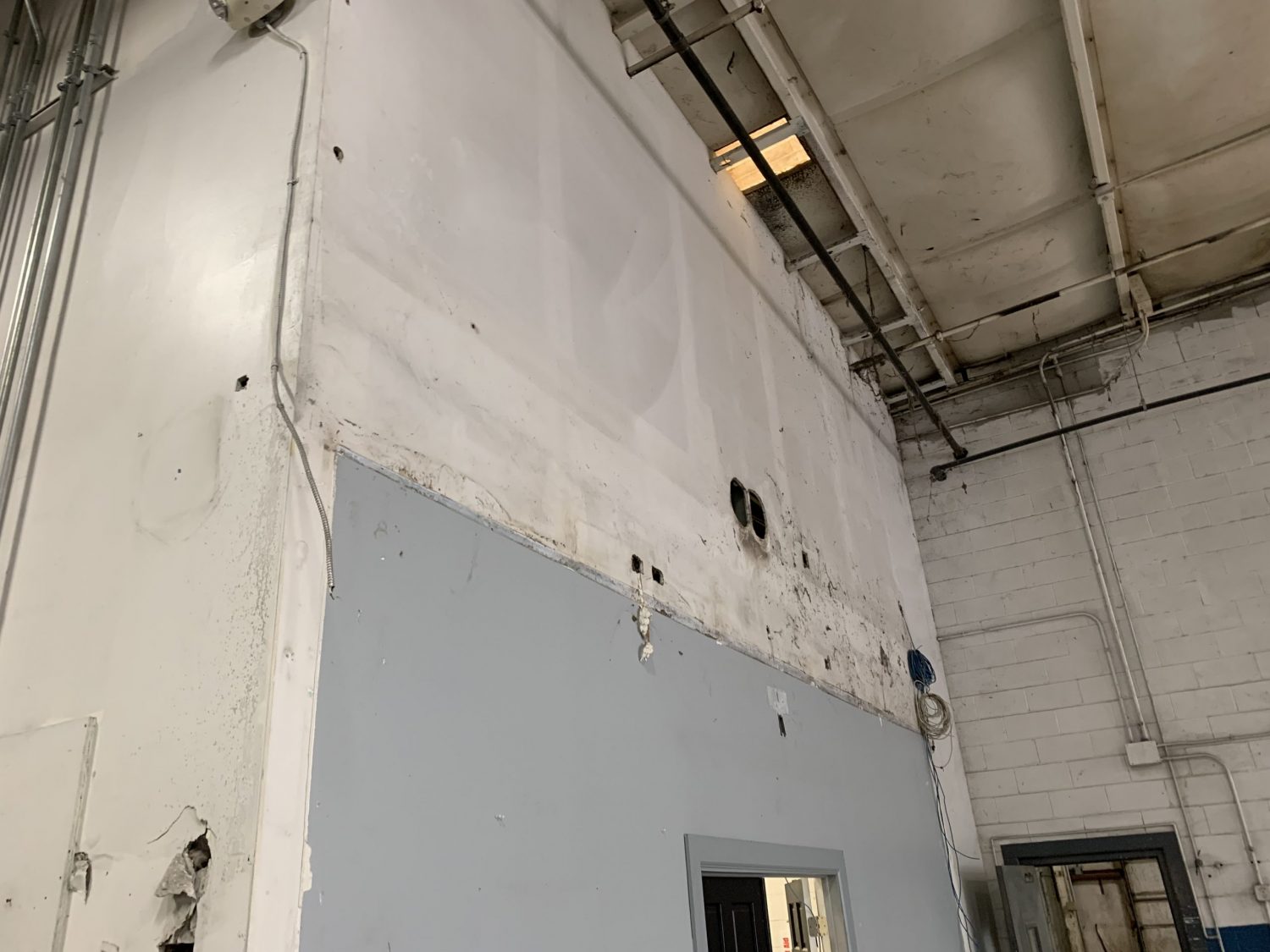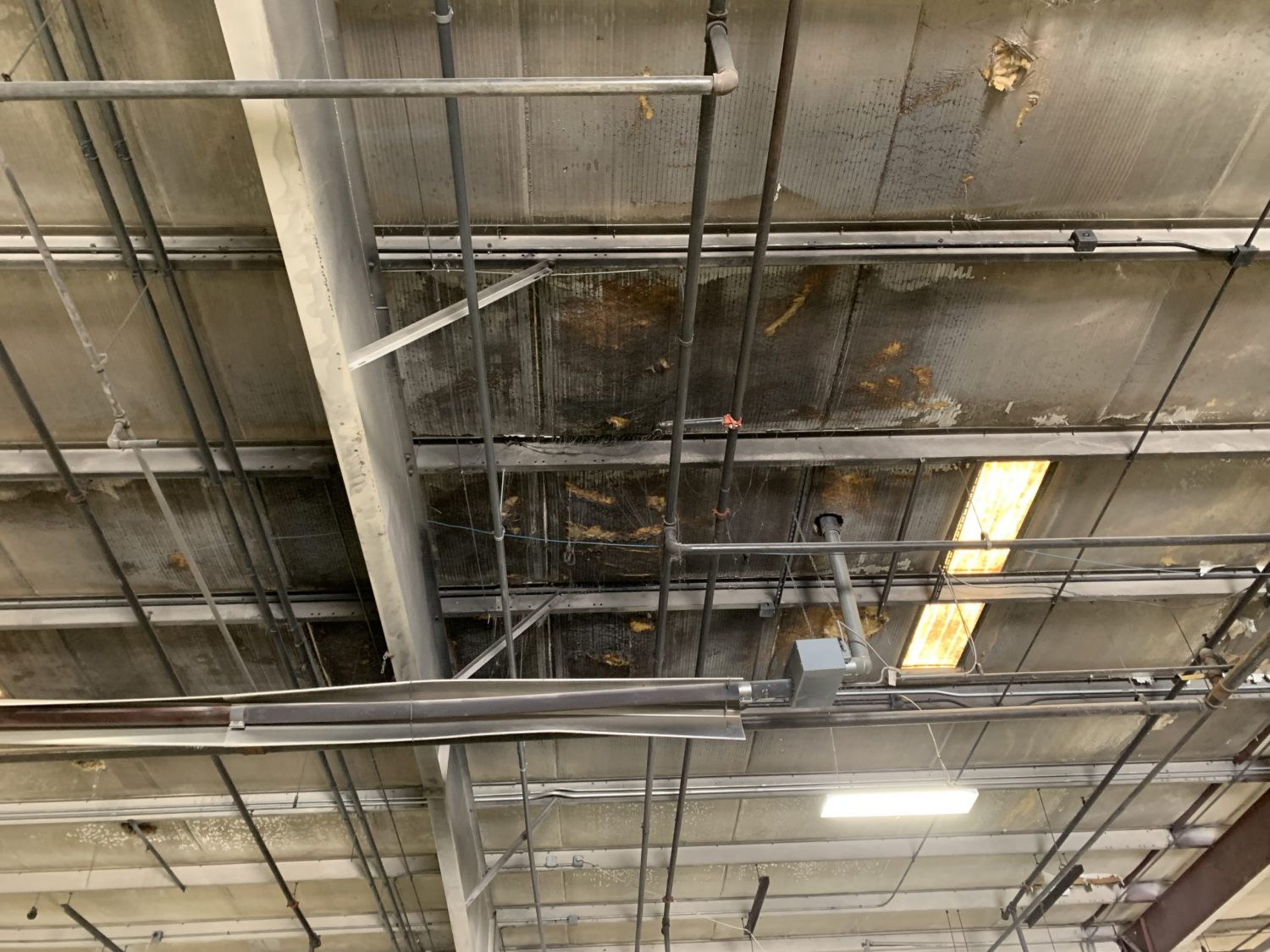The facility had peeling paint from different surfaces- metal deck ceiling, supports, trusses, metal L-beam supports and a metal crane unit. The walls of the facility were covered installation that had holes, tears and exposed parts from everyday wear and tear. Parts of the ceiling had smoke damage and other areas had grease from different machinery being used in the facility.