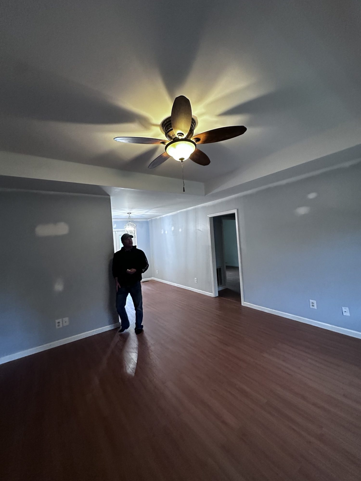 Our team began by protecting all floors and attached fixtures, such as lights and ceiling fans. We used a wet removal system to carefully remove the popcorn texture without damaging the underlying ceiling surface. Once the old material was removed, we repaired and skimmed the ceilings to a Level 4 finish, addressed any gaps with paintable caulk, and primed the entire space with one coat of flat primer. To complete the transformation, we applied two coats of flat white paint to achieve a clean, updated, and uniform look.