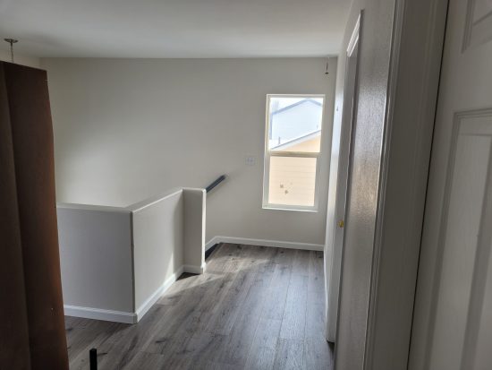 We carefully protected brand new floors, patched the drywall throughout the area, and then we painted the kitchen cabinets, ceilings, walls, baseboards, doors, door casing, stairway handrail, and stairway stringers.