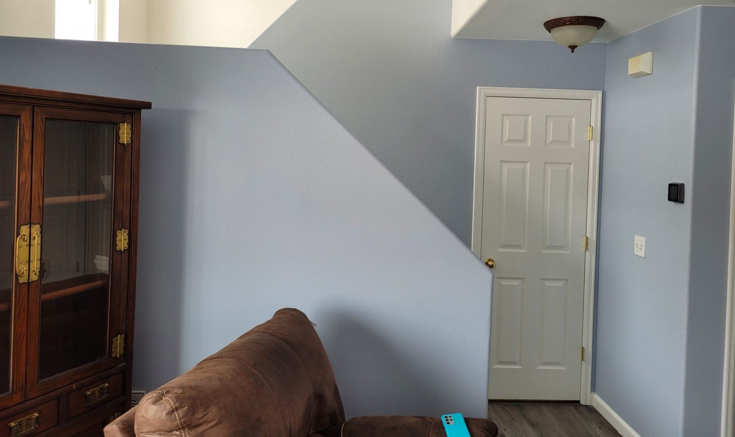 The living room and loft areas were some of the most used areas in the home. In addition to fixing the damage to the walls, the homeowners were hoping for a fresh color to modernize the area. Our professional color consultant worked with the client to choose this fresh sky blue color and white trim.