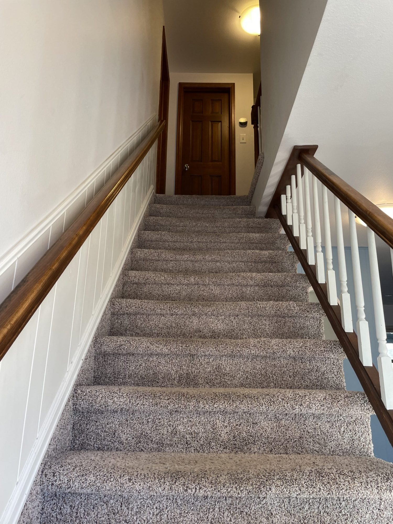 The project involved transitioning the stained wood surfaces to a painted finish, creating a sleek and modern look. Specifically, the team transformed the brown stair railings to a solid black, while the brown wood doors were painted a crisp white. The walls themselves remained untouched, as the homeowner was satisfied with their current color. These changes focused entirely on enhancing the woodwork, ensuring the new finishes would stand out against the existing backdrop.