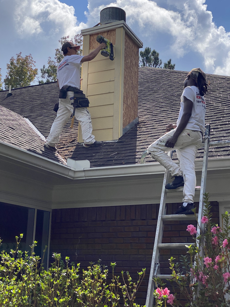 Our crew in action reframing a chimney that had wood rot. We replaced the old wood with Hardi Boards before painting.