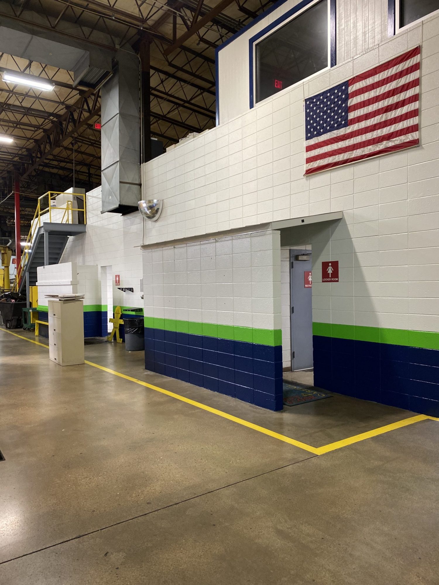 This commercial project involved repainting the interior of a regal Rexnord Auto Parts plant in Auburn, Alabama with a directional striped blue and green color palette. The company wanted to revamp the building, which was originally dull grey and red, to match their new color scheme. Our team had to maneuver around tight spaces with cages and racks in a fully operating plant in order to complete this project.