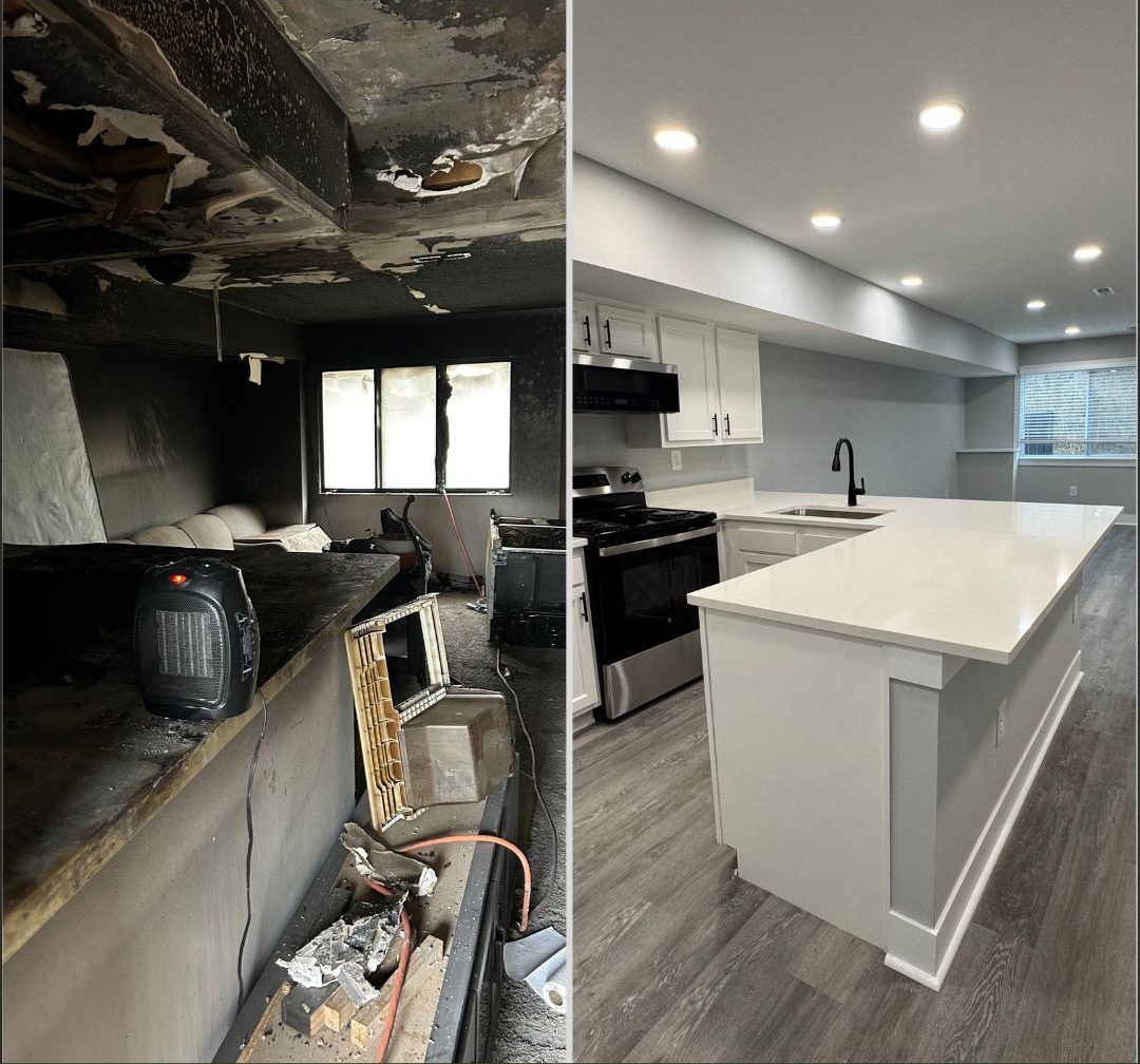This multi-phase restoration project required gutting the affected unit down to the studs in the kitchen and living room area to assess the full extent of fire damage. Capital Contracting Services, LLC managed the full renovation process, which included: