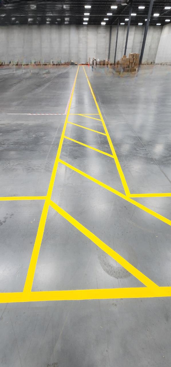 The project was completed successfully over the scheduled weekend, with no disruptions to the warehouse’s operations. The precision equipment ensured the lines were perfectly straight, and the careful planning meant they were placed in the exact spots needed to guide traffic and improve safety.The custom orange color was a perfect match to the client’s specifications, providing clear visibility and adding to the warehouse’s professional appearance.