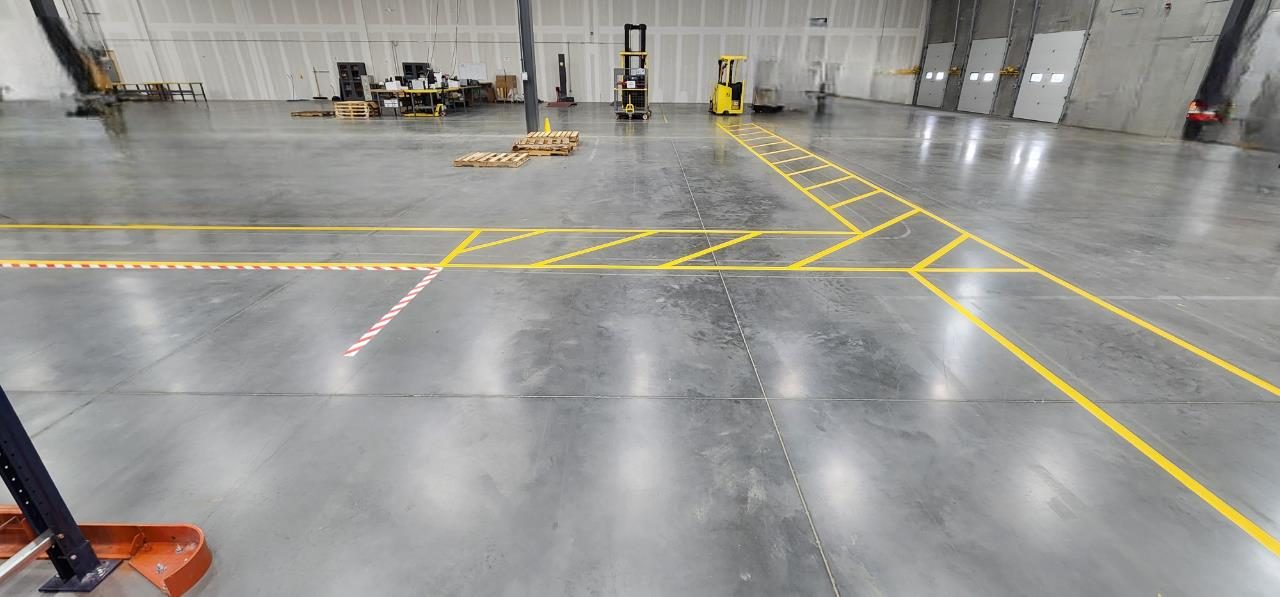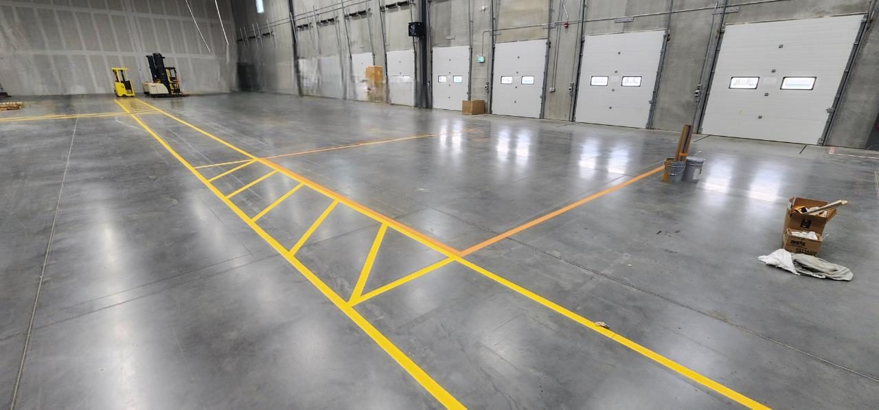 The project was completed successfully over the scheduled weekend, with no disruptions to the warehouse’s operations. The precision equipment ensured the lines were perfectly straight, and the careful planning meant they were placed in the exact spots needed to guide traffic and improve safety.The custom orange color was a perfect match to the client’s specifications, providing clear visibility and adding to the warehouse’s professional appearance.