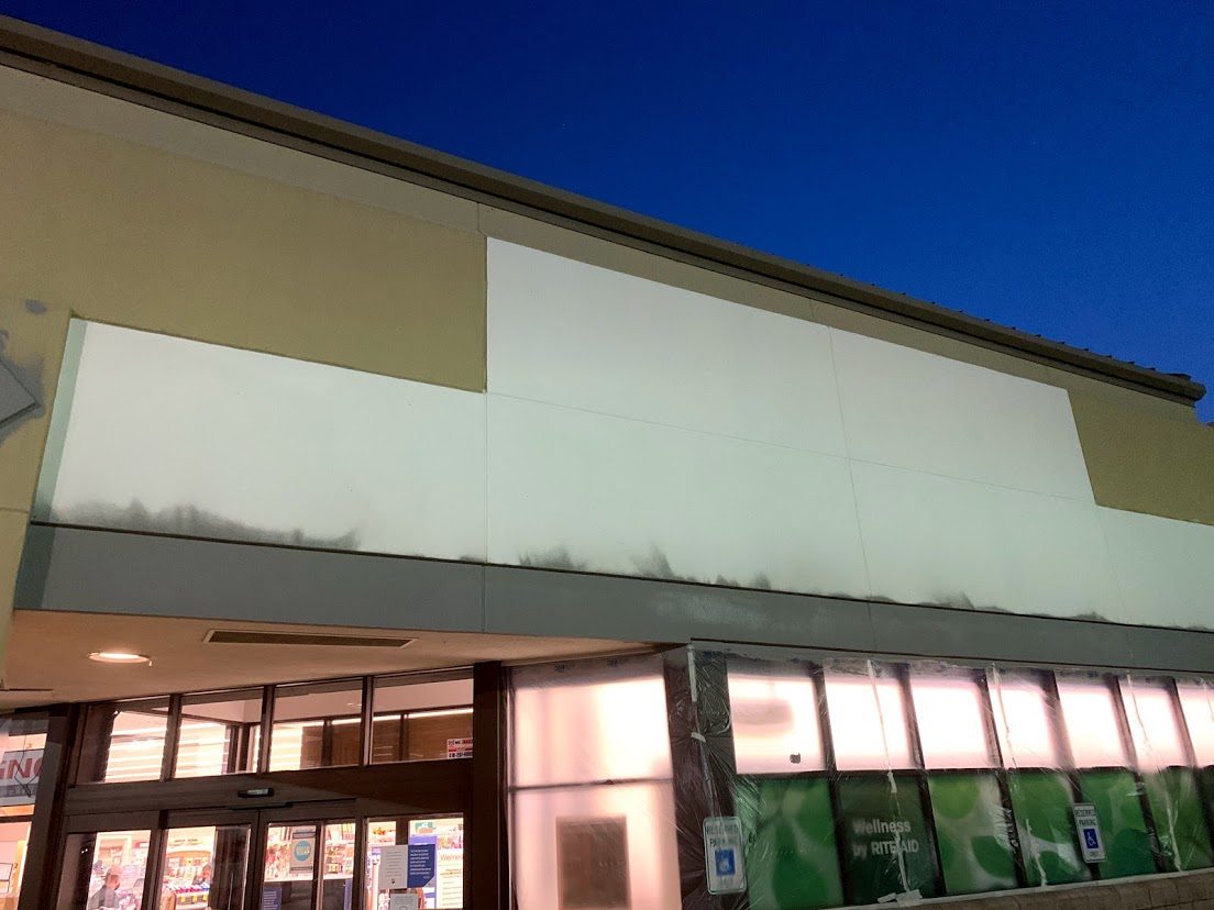 CertaPro Painters® of Grand Haven was contracted to help with exterior stucco repairs and painting for a Rite Aid pharmacy in Muskegon, MI. The pharmacy is a 1 story building approximately 12,600 sq ft in size. Multiple surface types were on the building that needed to be painted including a metal roof, metal doors, EIFS, and stucco on the exterior. CertaPro repaired the EIFS where the signs were removed to a like new condition, then all metal doors, stucco, and the metal roof were painted.