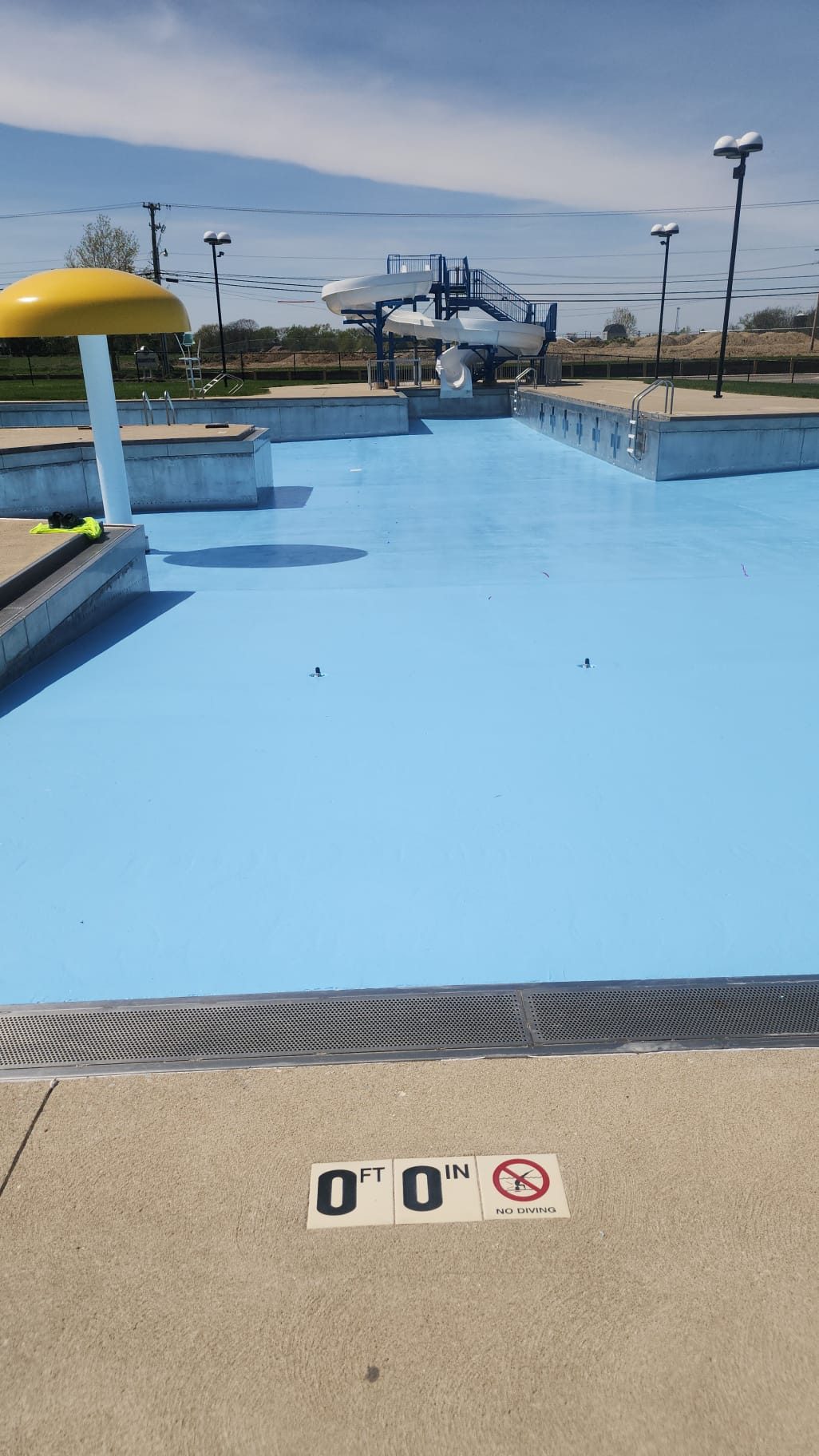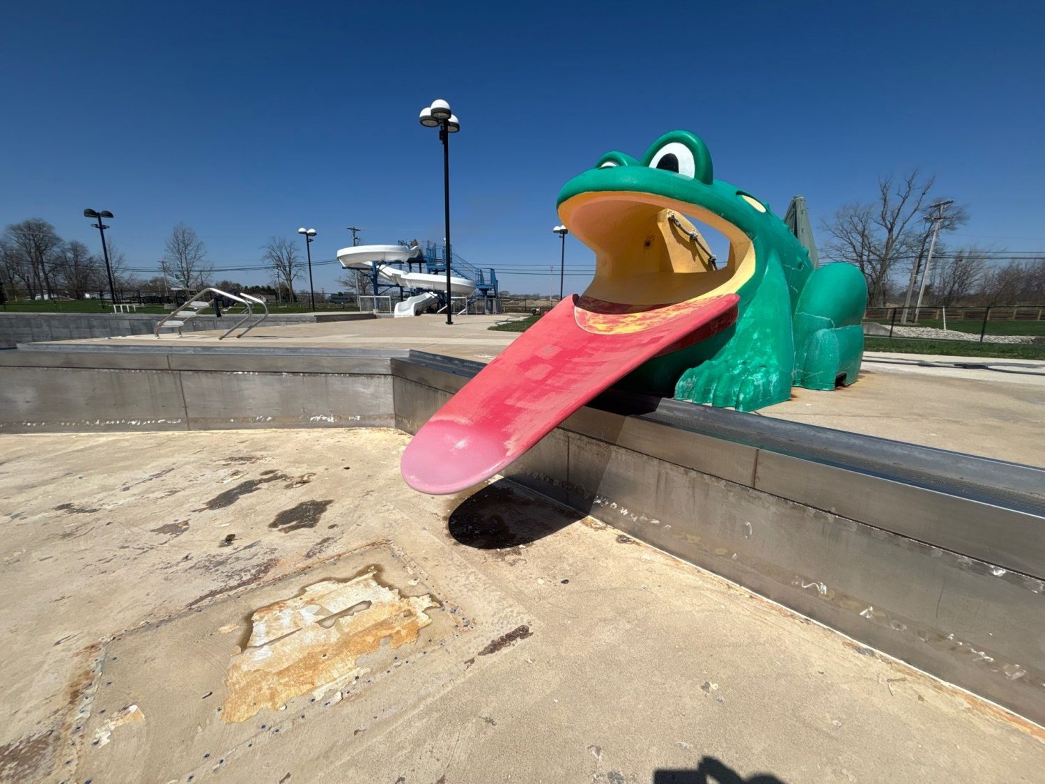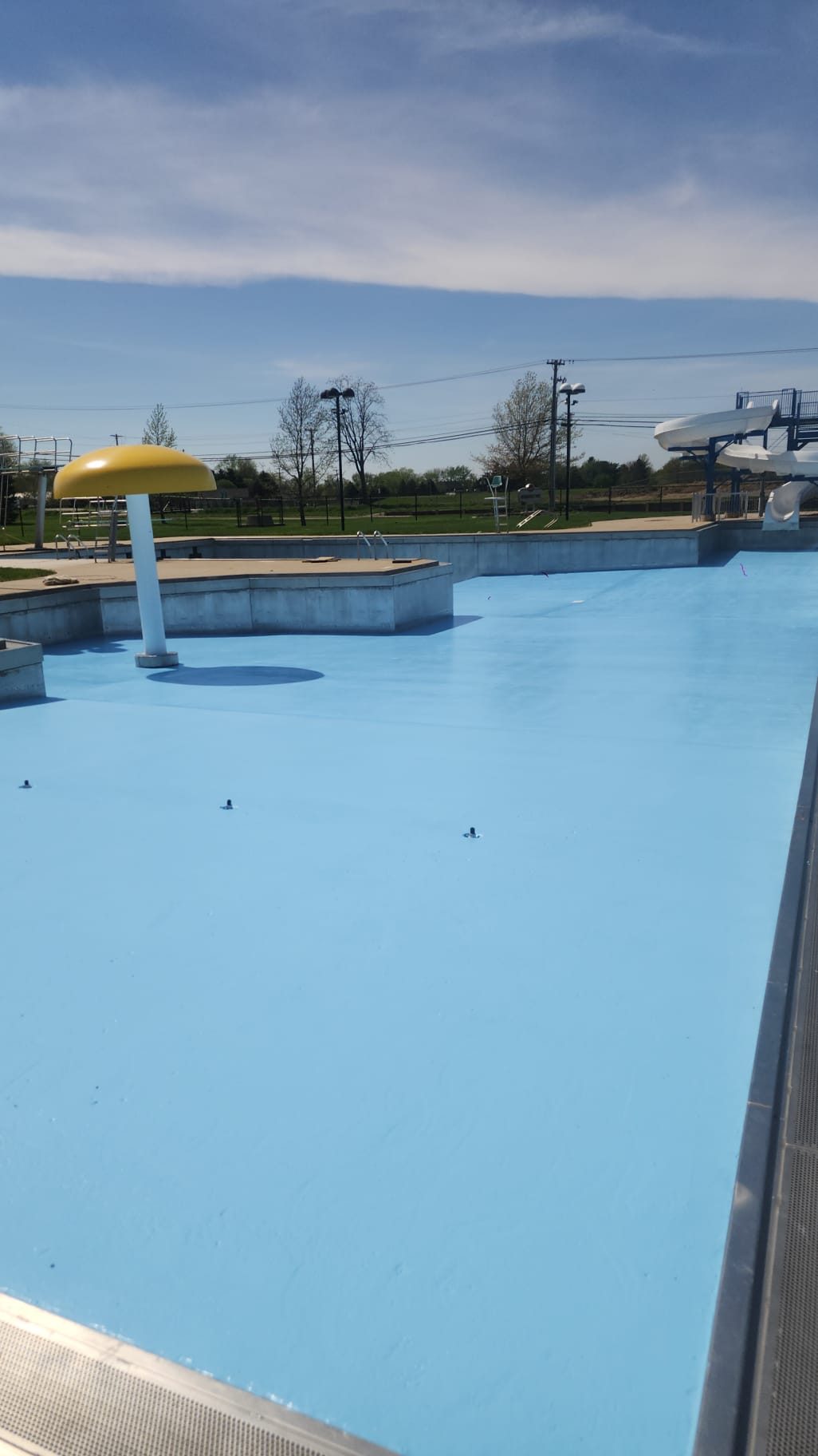In April 2025, a month-long renovation project took place in New Bremen, Ohio, at a large community swimming pool. The facility featured a main pool area, a children’s pool with a frog slide and umbrella foundation, a tall steel-framed slide, and decorative fencing.