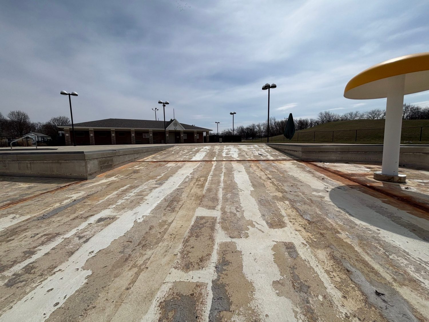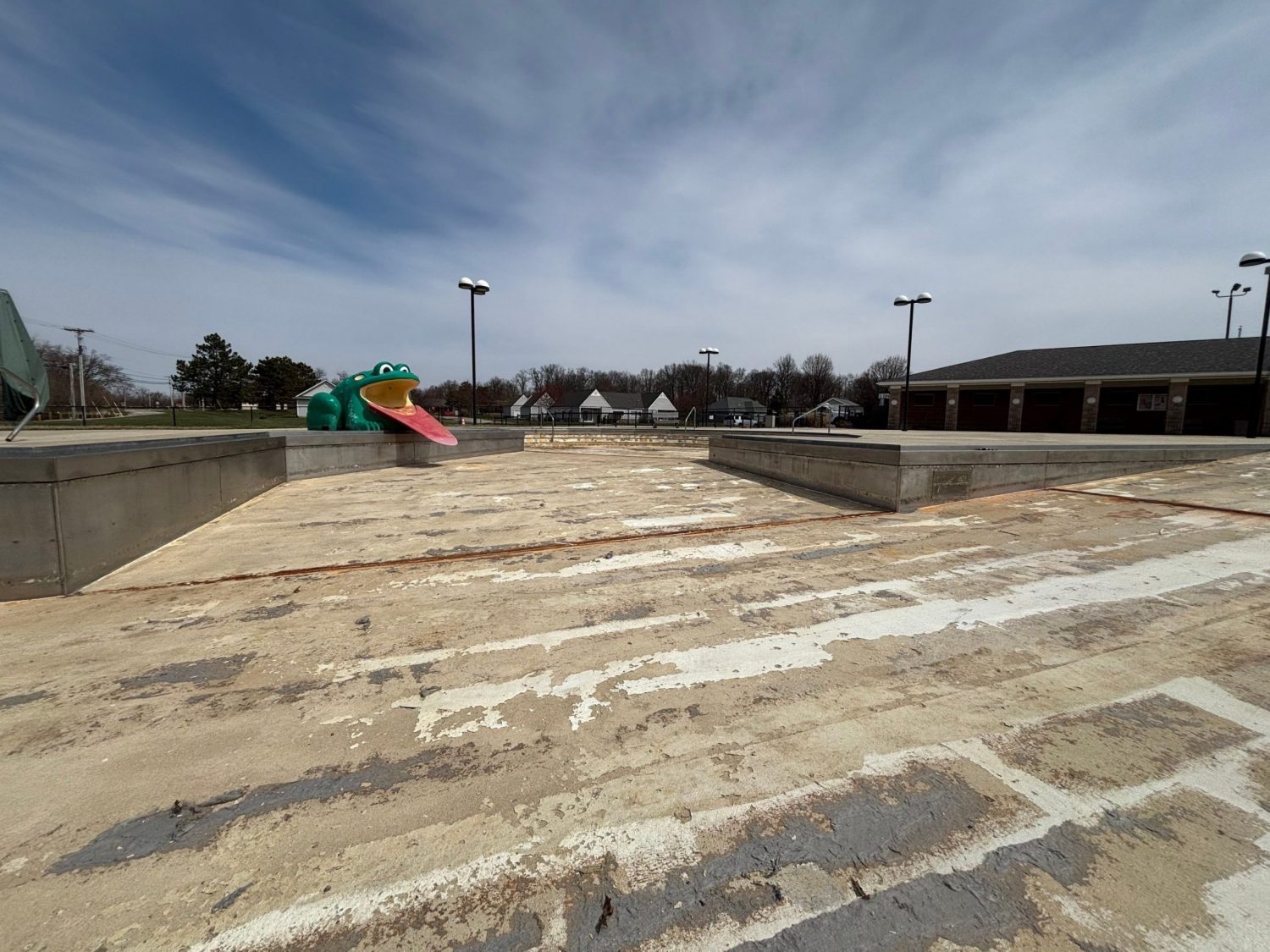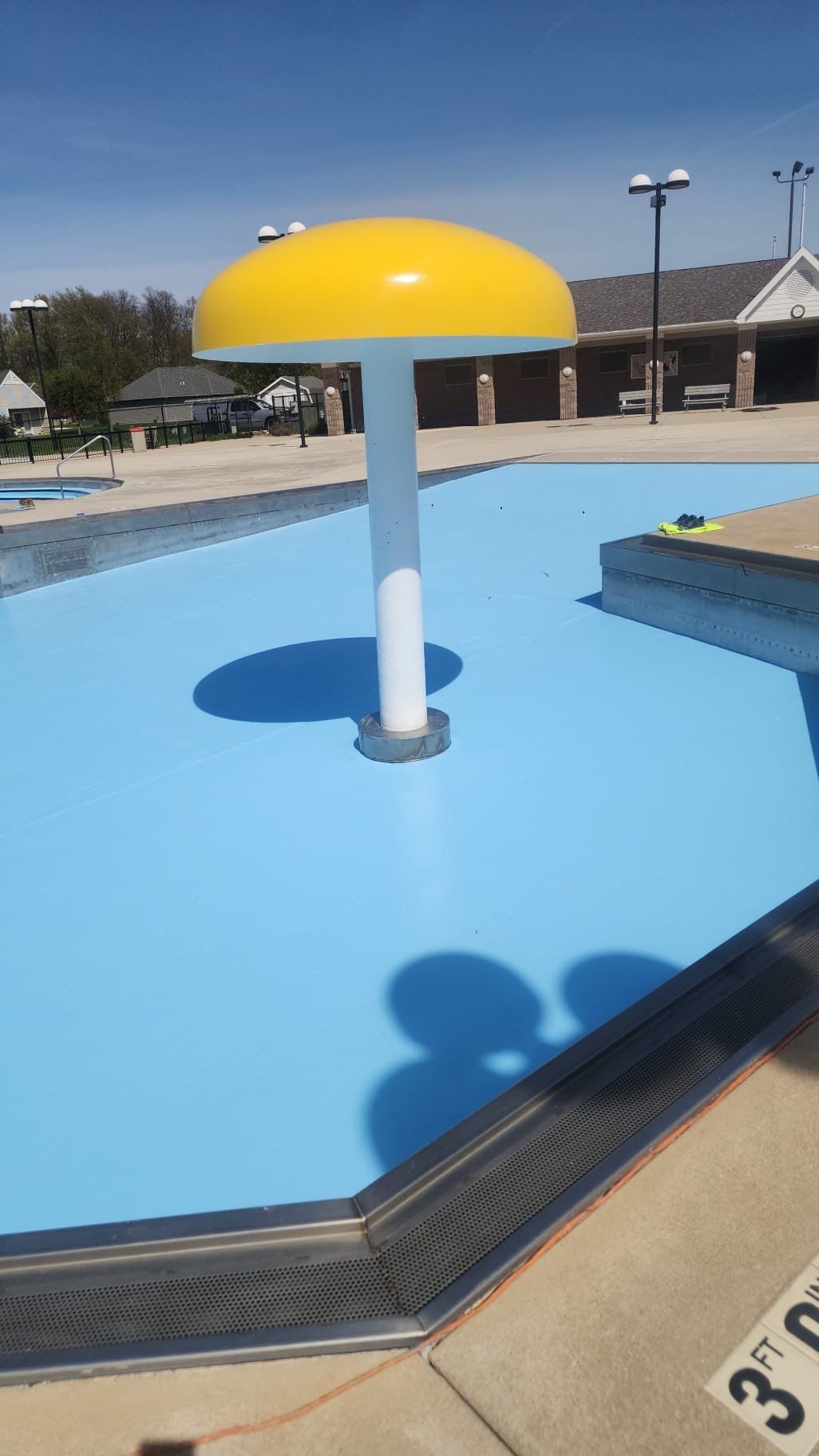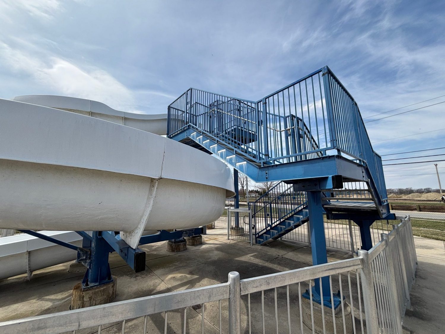 In April 2025, a month-long renovation project took place in New Bremen, Ohio, at a large community swimming pool. The facility featured a main pool area, a children’s pool with a frog slide and umbrella foundation, a tall steel-framed slide, and decorative fencing.