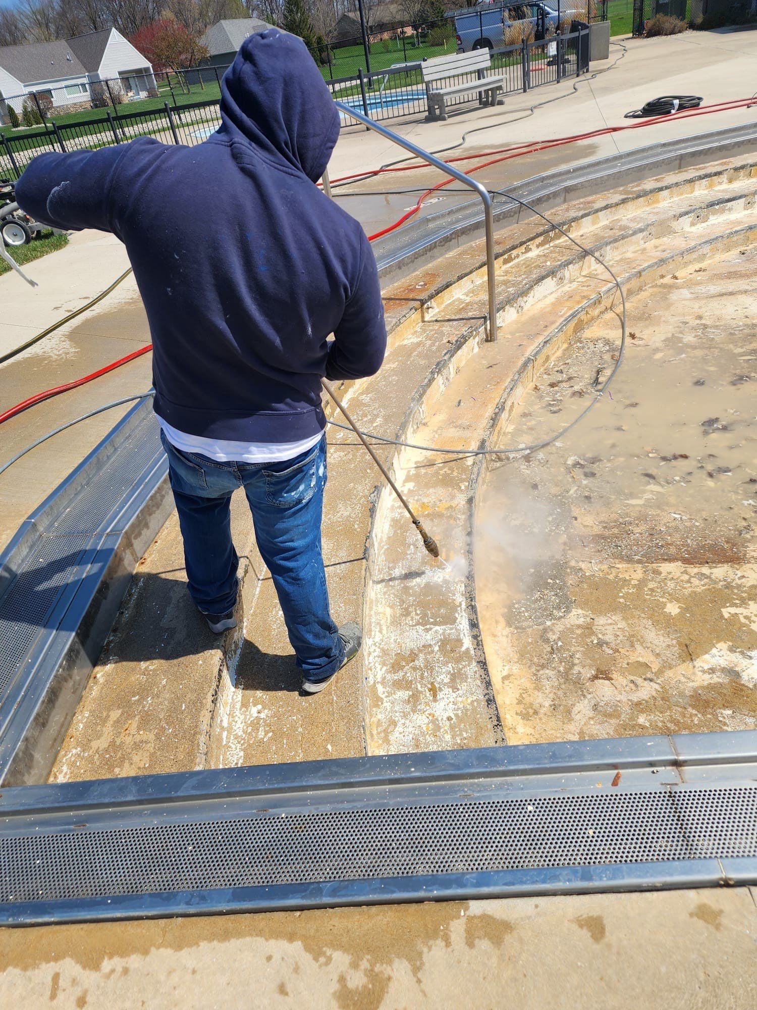 The pool deck was thoroughly cleaned using a rotary power washing unit, restoring it to a fresh and welcoming condition.