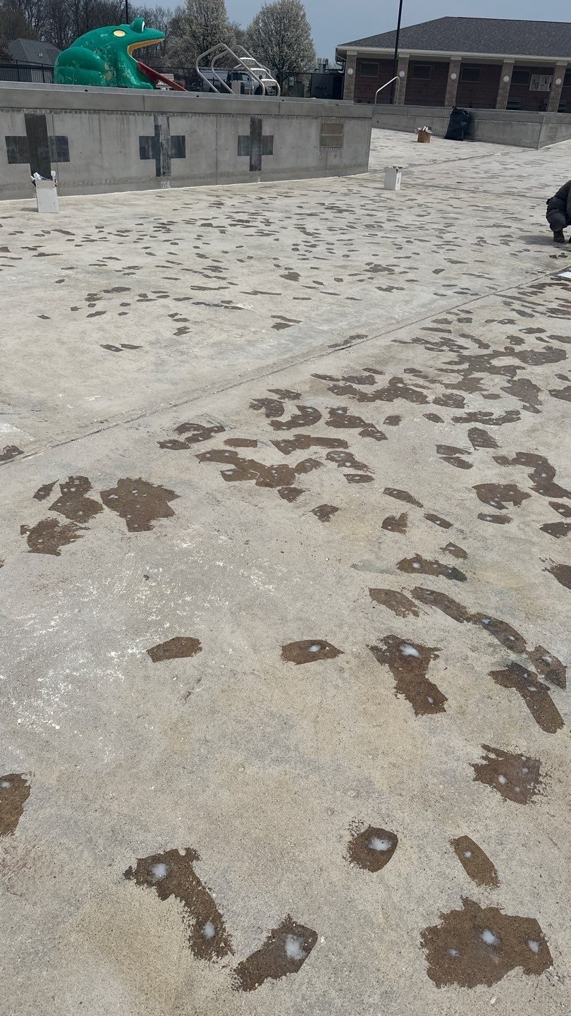 Prior to the project, the pool had a long history of issues with a leaking liner, which had been patched repeatedly over the years. Once the liner was finally removed, significant adhesive residue remained on the concrete floor, creating a major hurdle before any resurfacing could begin.