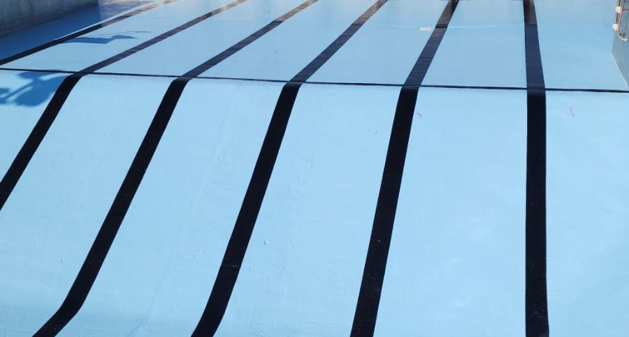 The renovation involved comprehensive repairs to the concrete structure, including replacing the expansion joints. After grinding away the old adhesive, the entire pool floor was coated with a durable epoxy finish. Additionally, all metal elements—including the faded slide structure and rusted framework—were carefully prepped and repainted.