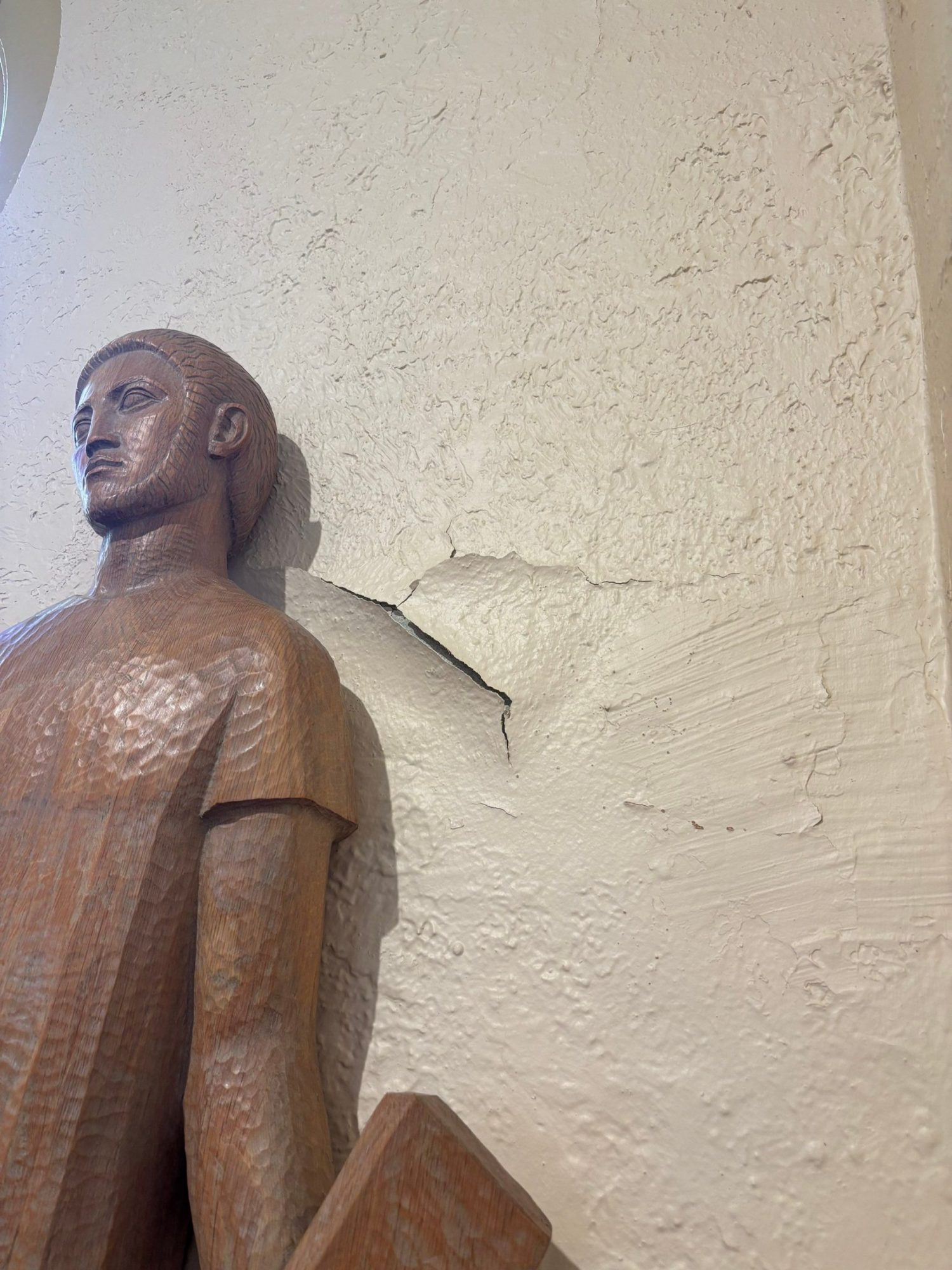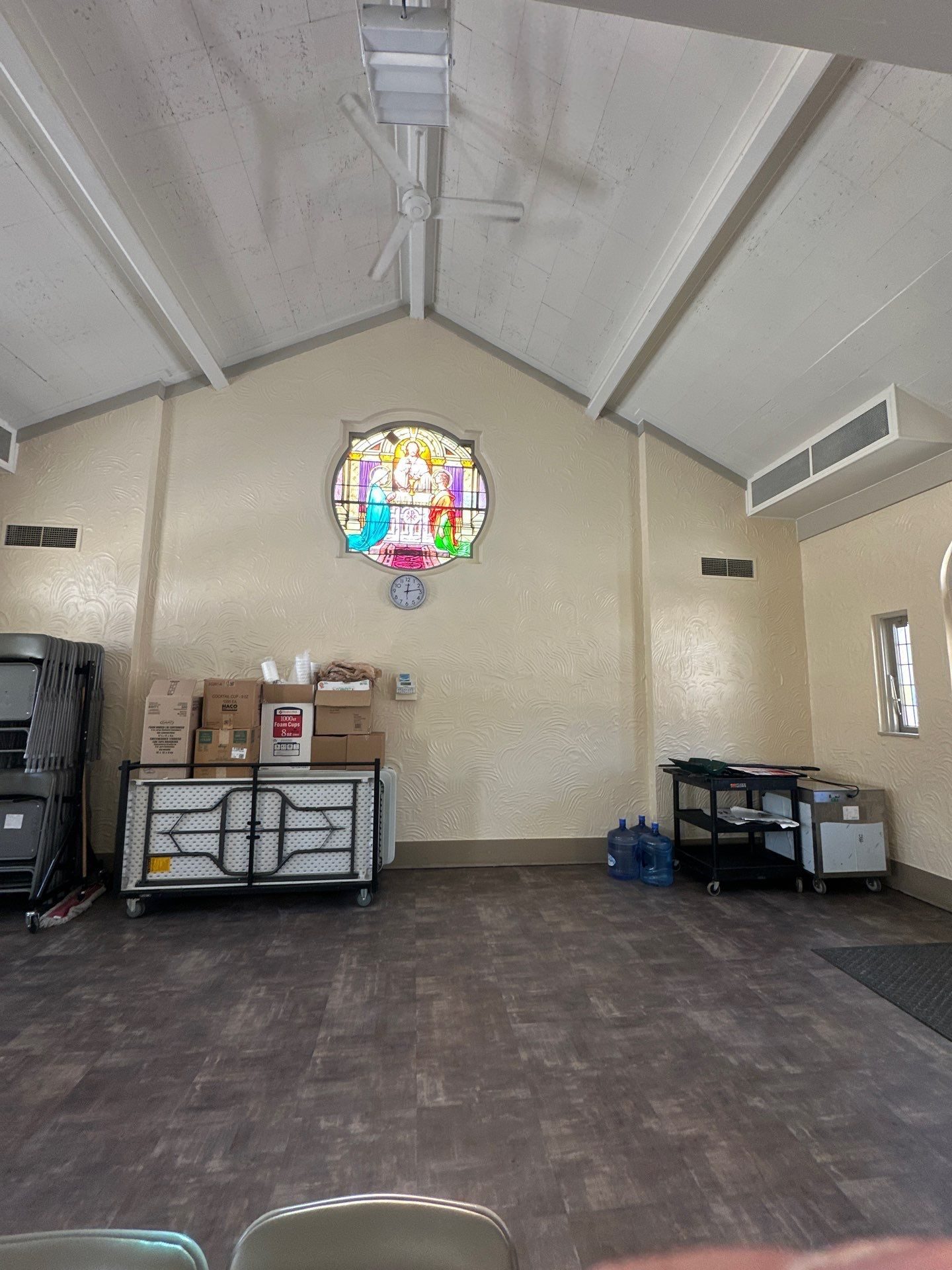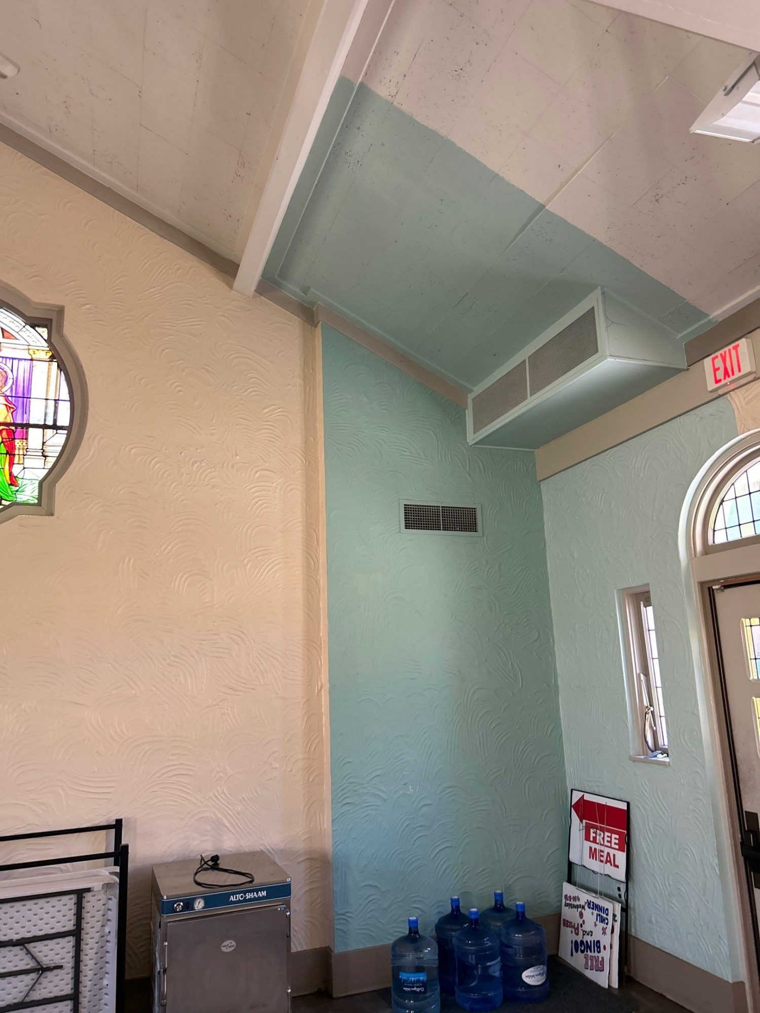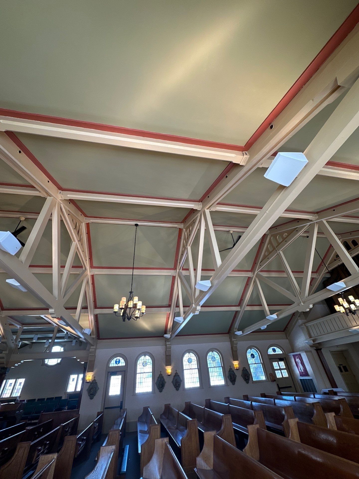 Areas that once showed signs of age, including faded finishes, cracking stucco, and visible wear on the ceilings and beams, have been carefully restored through thorough preparation and fresh coatings. The updated interior maintains the craftsmanship and architectural character of the church while creating a cleaner, more welcoming environment for parish members and visitors.