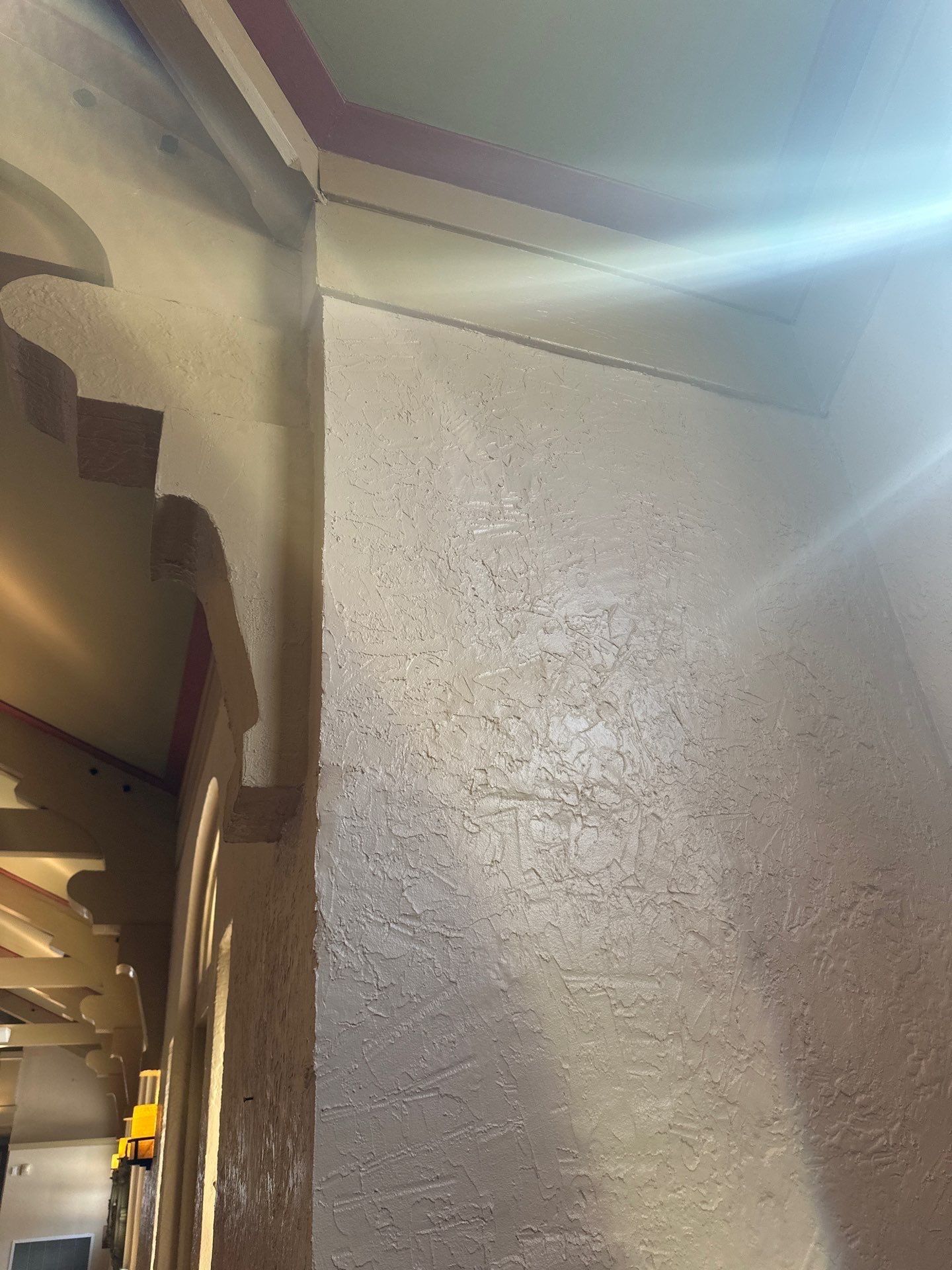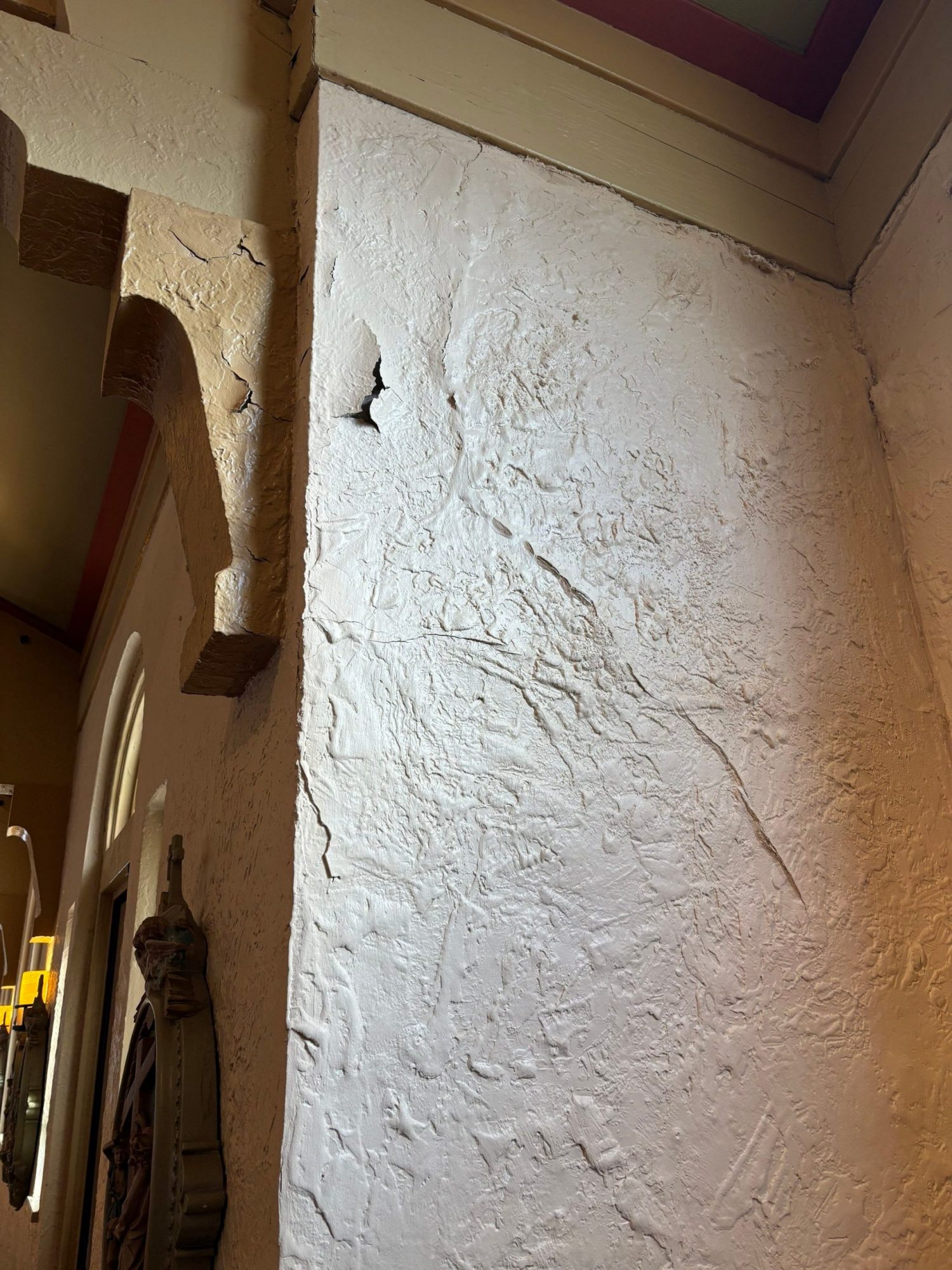 The building features a traditional stucco exterior and distinctive interior stucco finishes, including textured plaster walls and exposed structural beams that give the space its classic architectural charm. Over time, however, the interior had begun to show its age. The ceilings and beams displayed signs of wear and past damage, while the stucco walls had faded and developed visible cracking.