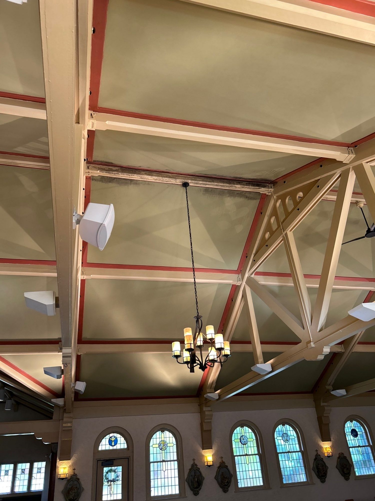 The project focused on restoring and refreshing the interior surfaces of Our Lady of Grace Parish while preserving the historic character of the 1911 structure. Work began with thorough surface preparation throughout the interior, including cleaning, scraping, and repairing damaged areas on the ceilings, structural beams, and stucco walls. This preparation helped remove aged coatings and address cracking in the stucco surfaces to ensure proper adhesion for the new finish.