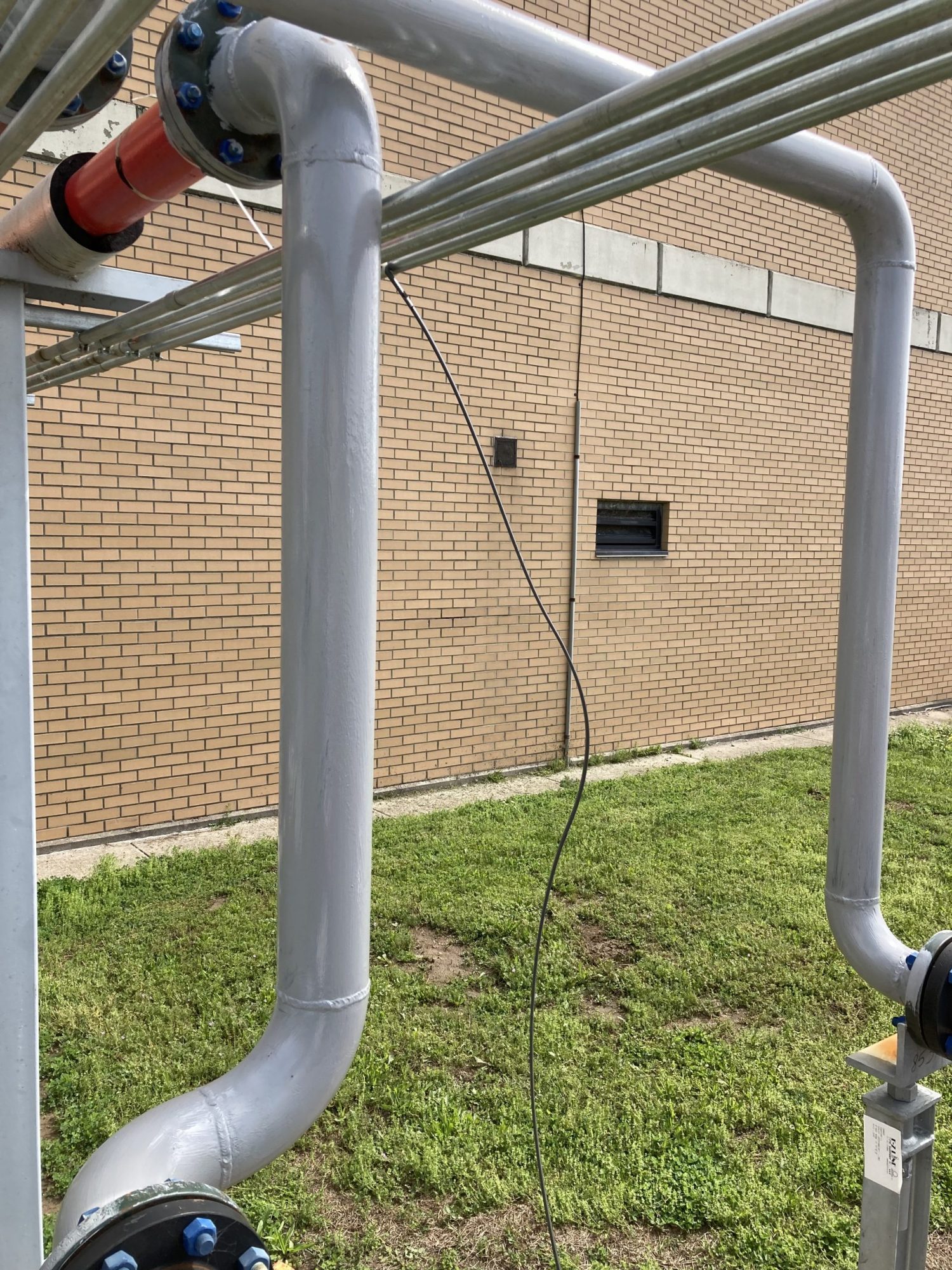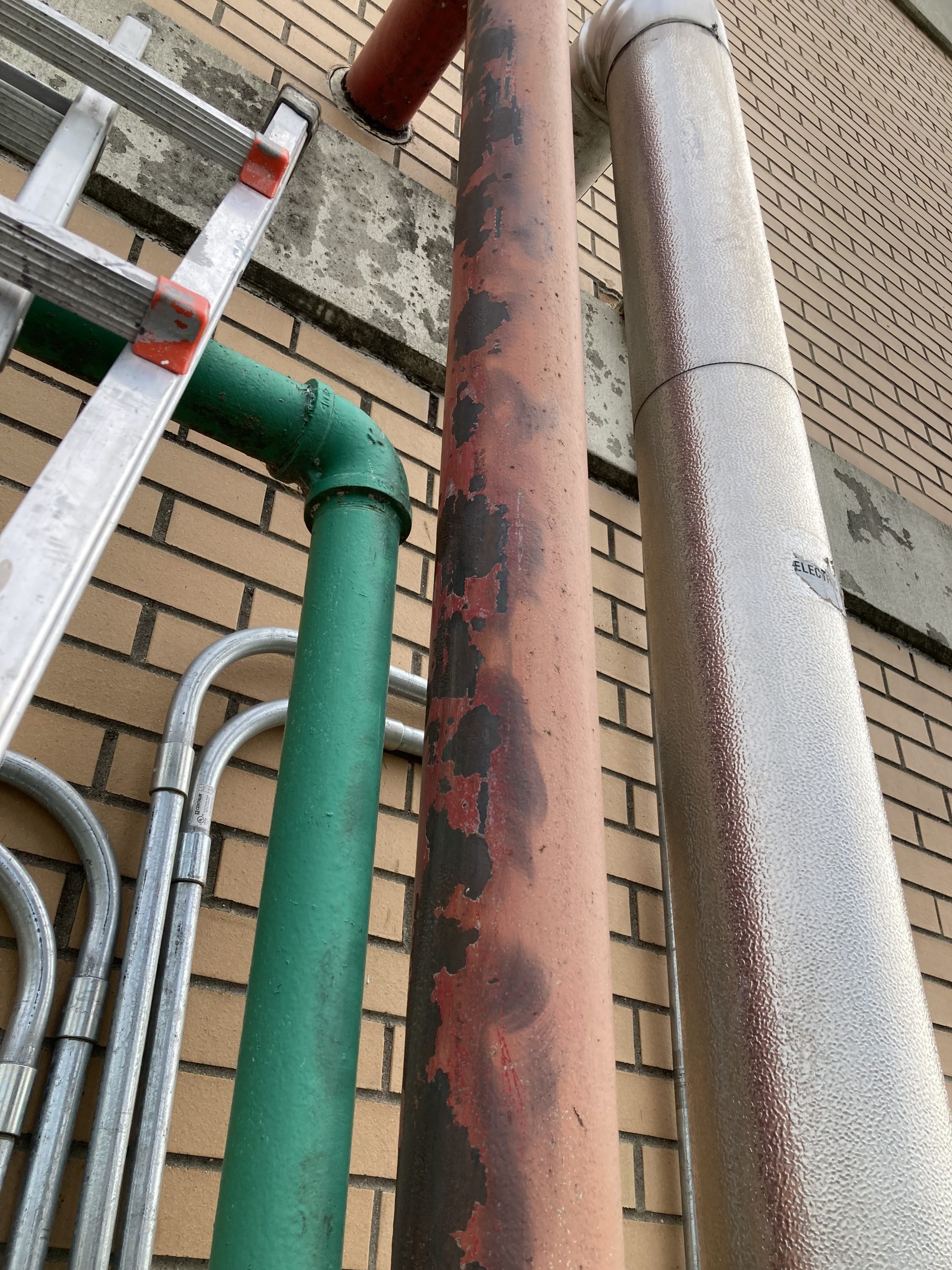The pipes were rusty and located in a secured area. These pipes are in the open air on the exterior of the building leaving them exposed to the elements.