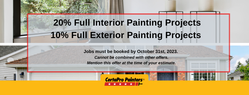 Get 20% Off on Full Interior Painting Projects, or 10% Off on Full Exterior Painting Projects. Jobs must be booked by 10/31/2023 for the discount to apply.