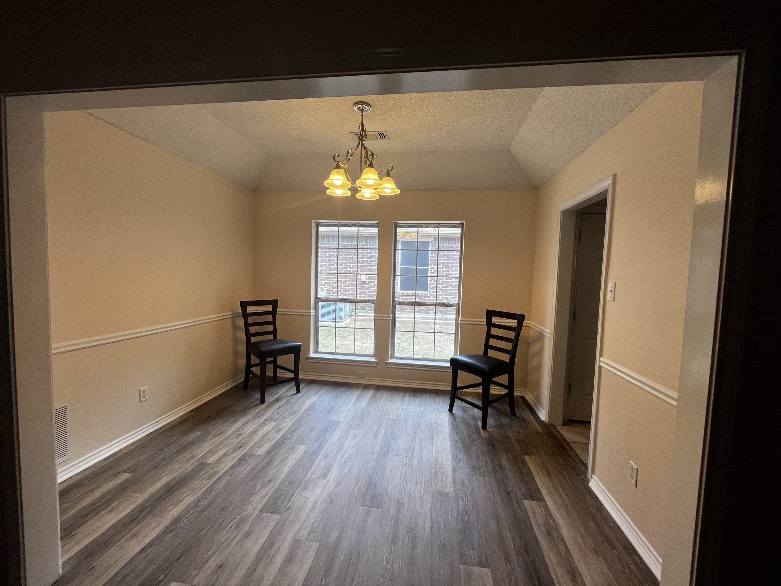 Before and after results of a wallpaper removal project in Denton, TX. This shows the results of wallpaper removal and interior painting in the resident’s dining area.
