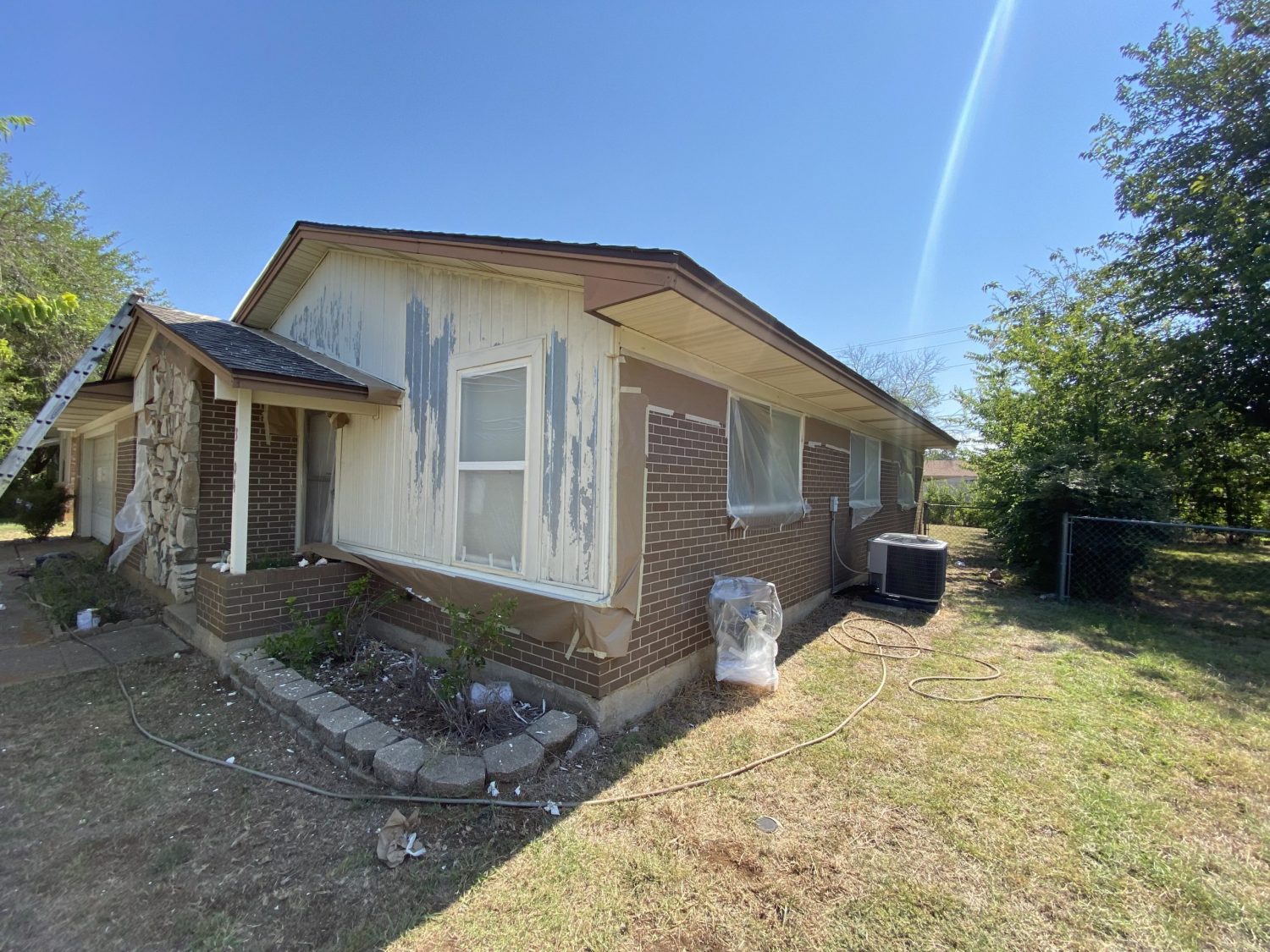 Exterior Painting Project scraping peeling paint and painting with a lighter green color.