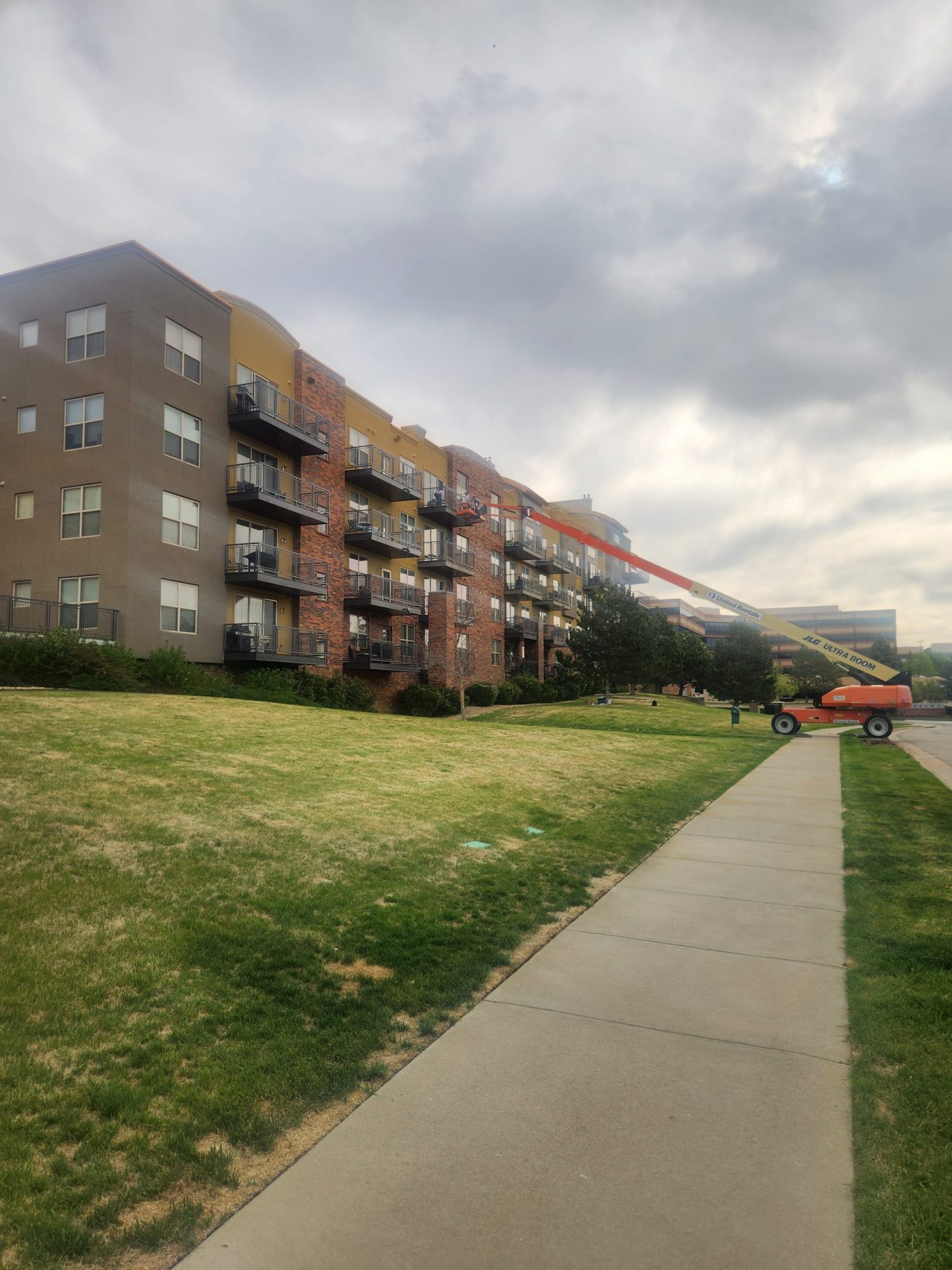 This project required thoughtful planning and precise execution to navigate several challenges. Working at height and around occupied units demanded close coordination with tenants to safely access balconies with minimal disruption. The crew operated a 125-foot boom lift to reach upper-level railings, taking extra precautions to protect turf and landscaping from the weight and movement of heavy equipment.