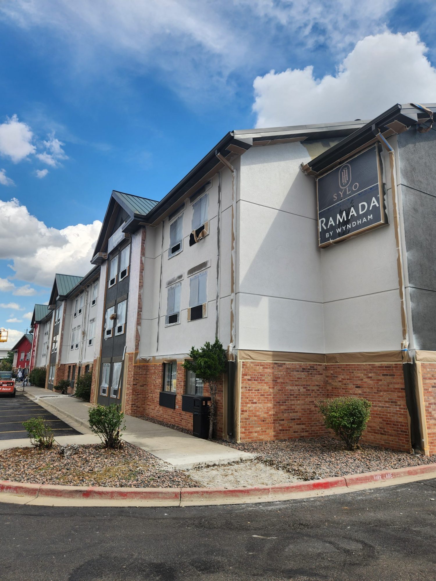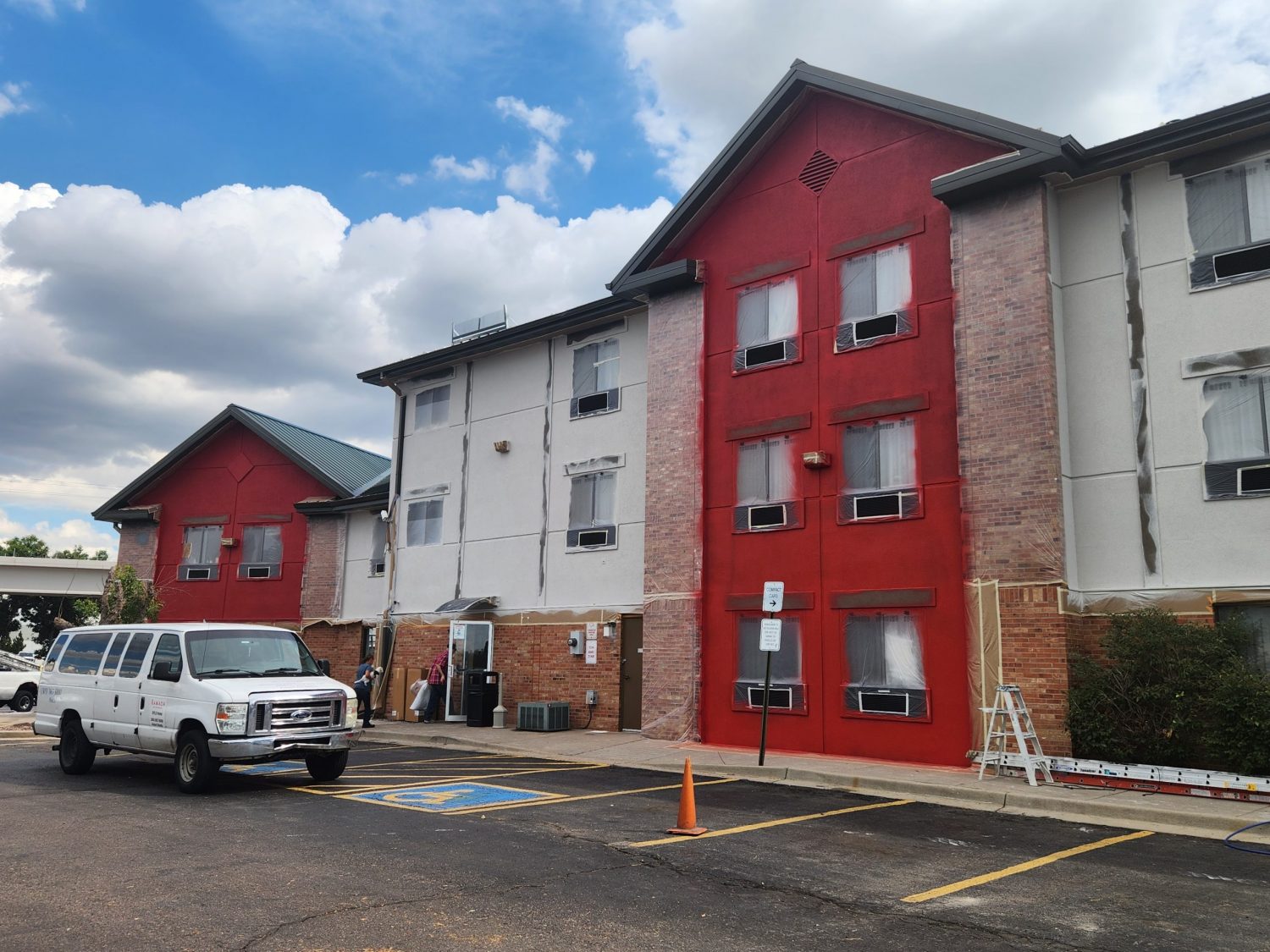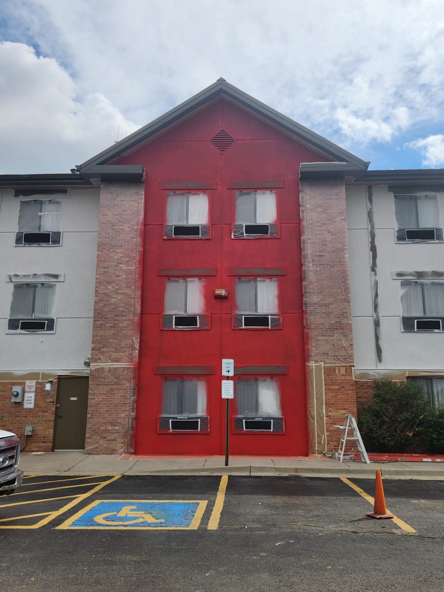 The Ramada Inn underwent a full exterior rebrand using client-provided color renderings. In addition to executing the new brand palette, we upgraded the paint system to ensure the red and dark accent colors would retain their vibrancy over time—an important factor for high-exposure hospitality exteriors.