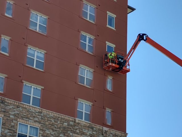 Using a boom lift to ensure a seamless, consistent finish on the high walls of the Wind Crest Retirement Community