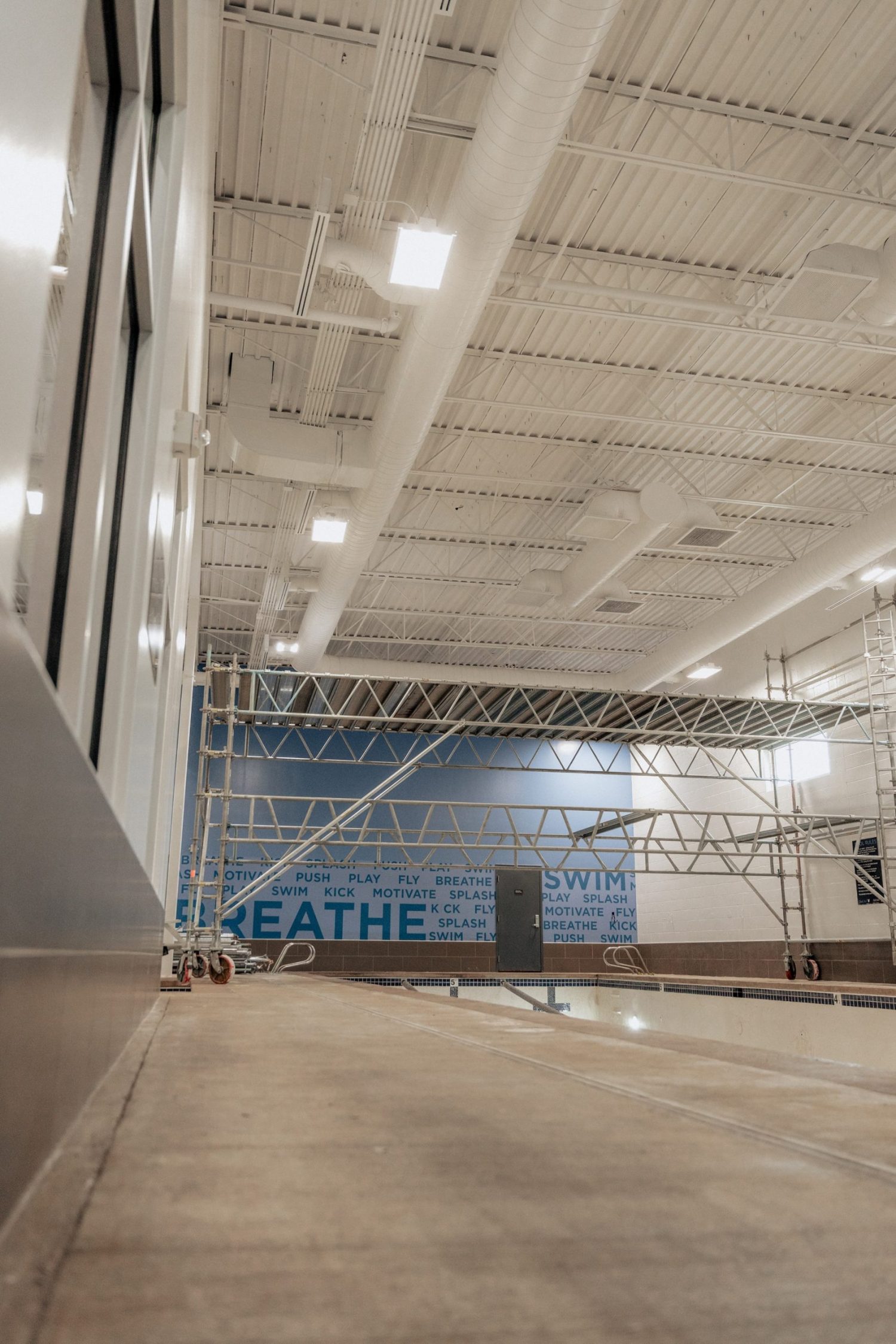 The scope included full edge-to-edge painting of designated areas, with special attention to masking vinyl wall logos and coordinating schedules to maintain member access and safety. All lifts and scaffolding were provided by CertaPro, including a bridge scaffold system for work above the pool area’s 22-foot ceilings. The wet area received a Pre-Catalyzed Epoxy paint system, chosen for its moisture resistance, durability, and ability to perform in high-humidity environments.