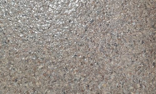 After floor prep, which include using a grinder on the floor and cleaning of the surface, a tinted base coat is applied on top of the concrete. Before the base coat dries, a layer of decorative chips are evenly spread across the surface and left to set for a few hours. Once dry, any excess chips are scraped off the surface and cleaned.