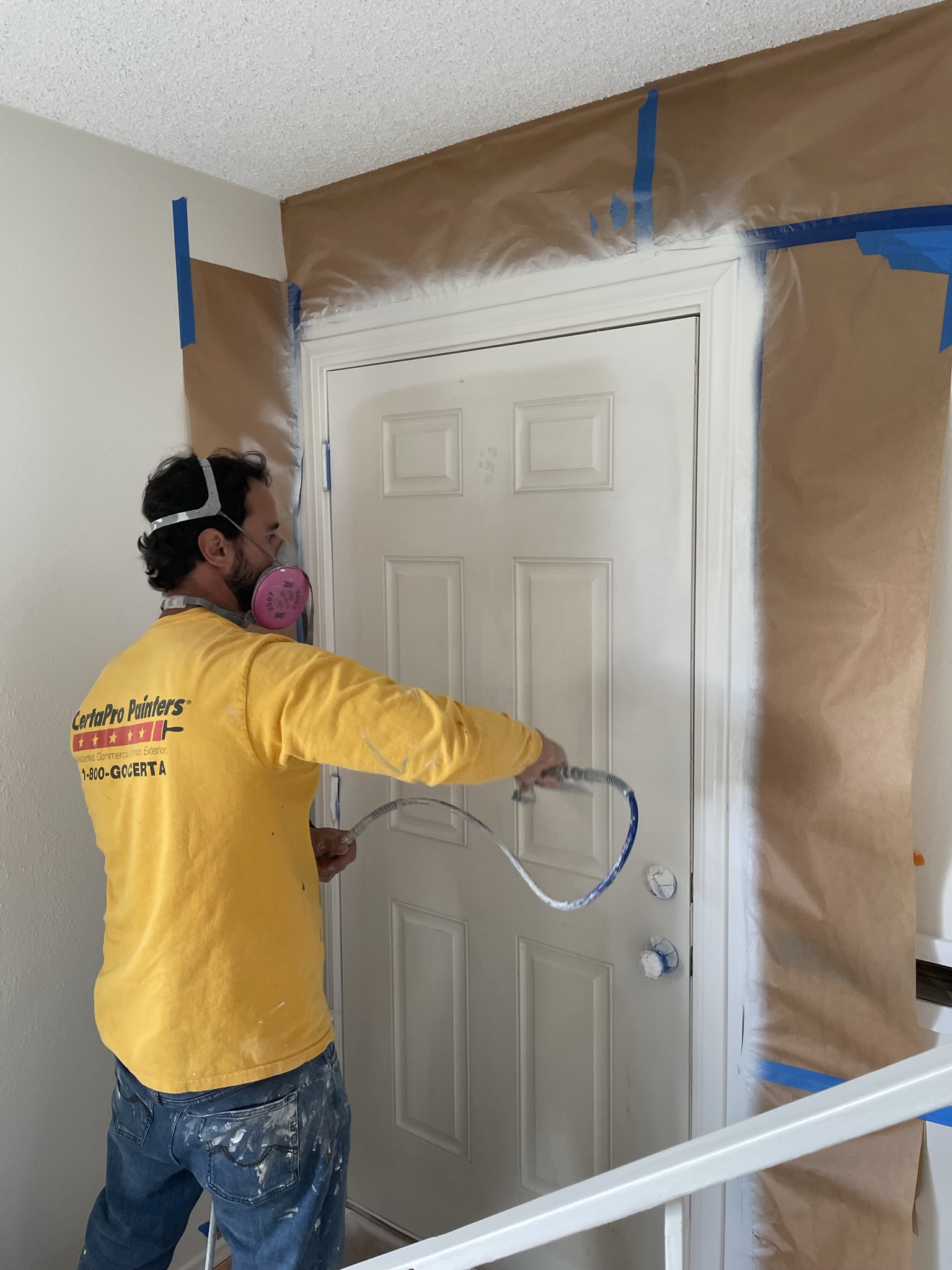 One way to quickly paint an interior door that provides maximum coverage and minimal brush marks is to use a spray rig. It makes quick work of what can be a detailed and fussy task.