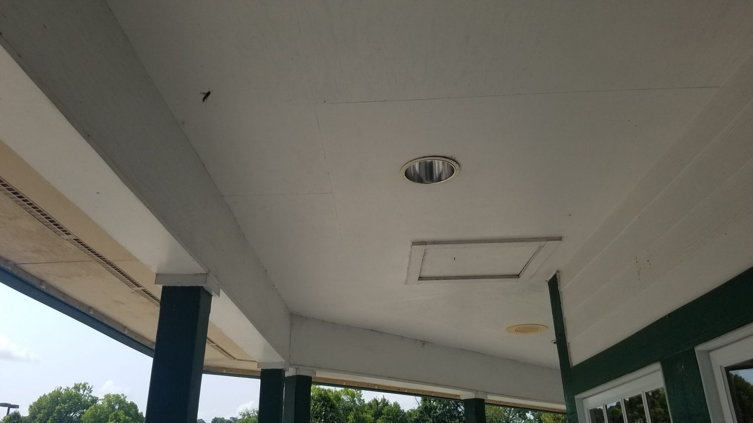 The ceilings along the walkway were repaired and painted now offer a smooth surface with bright white paint.